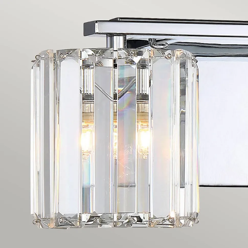 L’applique murale Divine 2 lumières est d’une sophistication exquise. La plaque arrière simple brille en chrome poli et reflète chaque coupe et chaque éclat du verre de cristal. Le verre réfracteur est disposé en lamelles épinglées en haut et en bas pour former un abat-jour autour de l’ampoule LED. Elle est classée IP44 pour la salle de bains.
