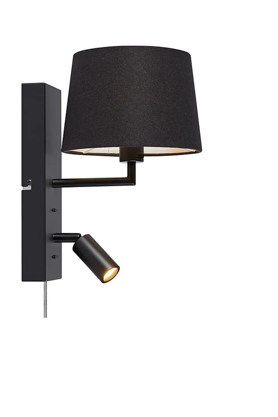 Une applique double fonction pour un éclairage optimalL’applique Como noire de Markslöjd est la solution parfaite pour ceux qui souhaitent allier confort et ambiance chaleureuse. Grâce à ses deux sources lumineuses distinctes, elle offre un éclairage ciblé pour la lecture ainsi qu’une lumière douce et tamisée pour créer une atmosphère agréable.Son design élégant associe une base en fer noir à un abat-jour en lin noir qui diffuse une lumière chaude de 3000 K, idéale pour une chambre, un salon ou un coin lecture cosy.Le spot de lecture, équipé d’une LED fixe de 3 W, est orientable et très pratique pour un éclairage précis, tandis que l’abat-jour plus large propose une lumière d’ambiance douce et enveloppante.Fonctionnalités pratiques et designL’installation est facilitée grâce à un boîtier de jonction intégré et un support mural solide. Deux interrupteurs séparés permettent de contrôler indépendamment l’éclairage principal et la lampe de lecture.Le câble transparent de 2 mètres apporte une discrétion maximale et s’adapte parfaitement à tous les intérieurs.Une applique qui combine élégance, fonctionnalité et confort pour illuminer vos espaces de vie avec style et efficacité.