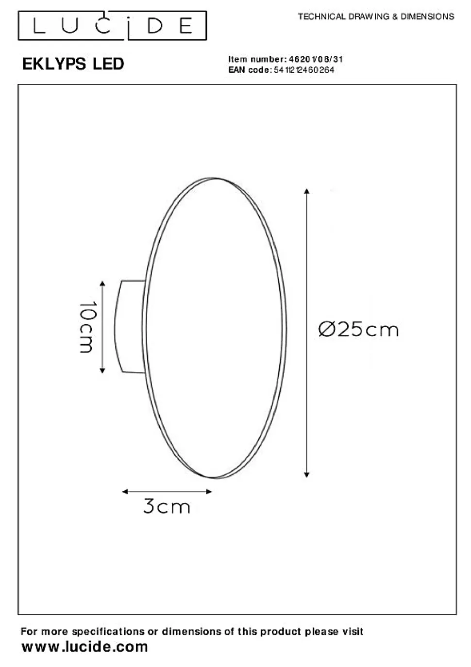 Profitez d’un charmant spectacle de lumière. Avec Eklyps LED, c’est possible tous les jours. Ce beau disque LED est une applique murale qui saura ajoutera une touche de convivialité chez vous. L’effet d’Eklyps LED sur vos murs doit être vu. Elle saura trouver sa place dans les intérieurs modernes. Choisissez vous-même où la placer. Cela peut être dans votre salle à manger, couloir, pièce à vivre ouverte ou dans votre chambre. Derrière un disque métallique élégant, un anneau LED diffuse une belle lueur à 360. Eklyps est le luminaire ambiant par excellence. Avec un diamètre de 25 centimètres, une seule suffit pour illuminer un petit espace.Caractéristiques uniques:• Équipé d’une lampe LED intégrée• Dispose d’une lumière blanche chaude (3000K)• Facile à connecter à un interrupteur mural (non fourni)• Fabriqué en aluminiumPrincipales caractéristiques du produit:• Consommation énergétique: 1x9W / 230V / Sans intensité variable (Ampoule incluse)• Dimensions: Ø25 cm Haut.3 cm• 3 Ans garantie sur le luminairePourquoi choisir l’éclairage Lucide?Lucide incarne un design innovant, un savoir-faire artisanal et une fiabilité exemplaire. En tant qu’entreprise familiale belge avec plus de trois décennies d’expertise, nous concevons des éclairages de haute qualité qui enrichissent et transforment chaque espace, tant intérieur qu’extérieur. Notre collection polyvalente comprend des luminaires durables et des sources lumineuses économes en énergie, soigneusement conçus par nos propres experts et fabriqués selon les normes CE les plus strictes. Grâce à notre large gamme, nous vous proposons toujours une solution d’éclairage adaptée, quel que soit le style ou l’espace. Ainsi, nous illuminons non seulement votre espace de vie mais aussi votre processus de choix dans la recherche d’un éclairage de qualité et abordable. Chez Lucide, nous combinons innovation et savoir-faire pour un éclairage qui ajoute no…