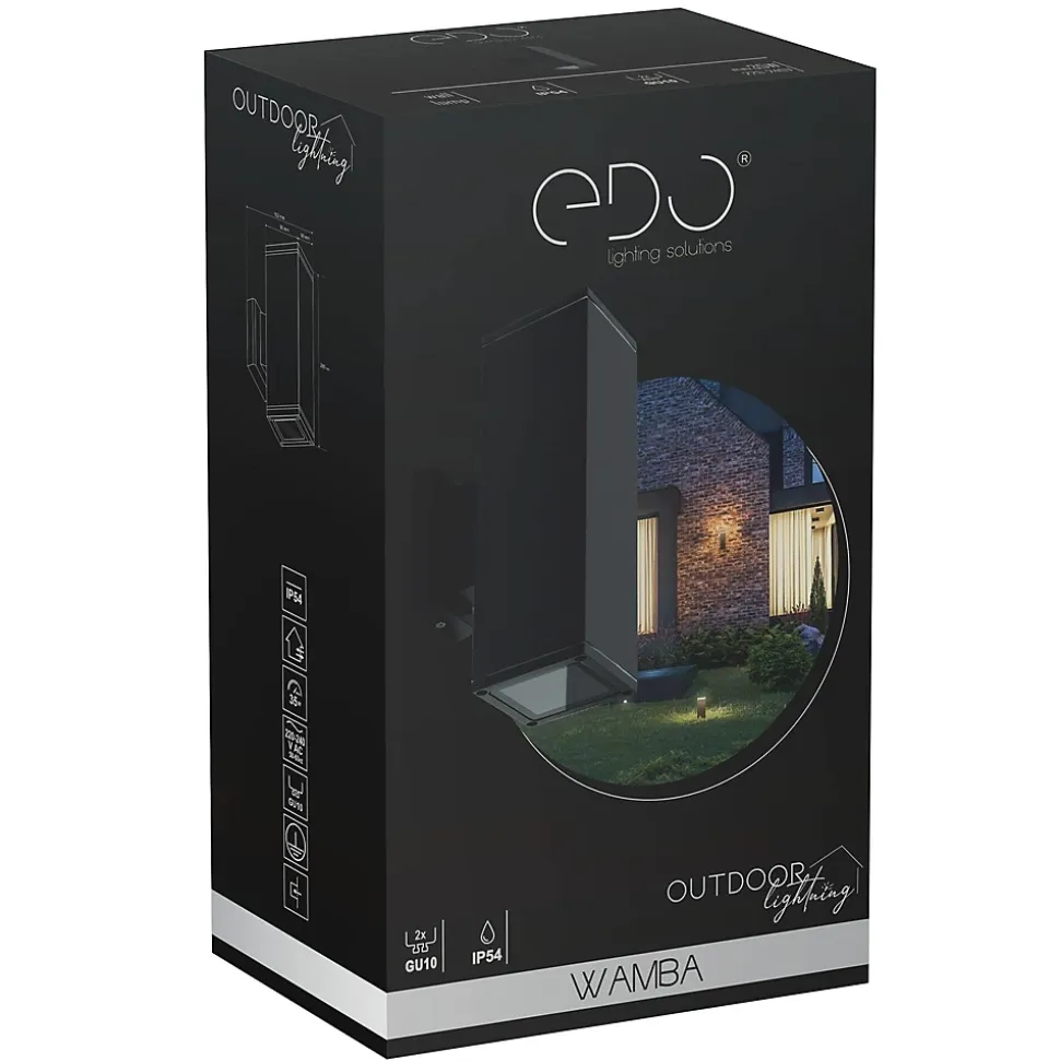 Luminaire de façade pour jardin, applique murale WAMBA, IP54, 2xGU10, 220-240V, noir EDO777353 EDO Garden LineL’applique murale WAMBA est une lampe murale simple et robuste destinée à un usage extérieur, fabriquée en aluminium et en verre durables, ce qui lui confère une résistance à la pluie, à la poussière et aux conditions météorologiques changeantes.Elle dispose de deux emplacements pour ampoules GU10 qui peuvent être orientées dans différentes directions, offrant un éclairage pratique vers le haut et vers le bas.Dimensions [mm] : ✔️hauteur de l’abat-jour : 265 mm✔️largeur de l’abat-jour : 90 mm✔️profondeur de l’abat-jour : 90 mm✔️hauteur totale : 265 mm✔️largeur totale : 90 mm✔️profondeur totale : 152 mm✔️applique murale : 104 x 75 x 21 mmCARACTÉRISTIQUES TECHNIQUES:✔️Lieu de montage : mur✔️Type de raccordement : cube à vis hermétique✔️Couleur : noir✔️Type de finition : sablé✔️Matériau du boîtier : aluminium✔️Matériau du cache : verre✔️Réglable : non✔️Diffuseur : mat, transparent✔️Douille incluse : oui✔️Type de douille : GU10✔️Nombre de douilles : 2✔️Source lumineuse incluse : non✔️Puissance maximale [W] : 2x35W✔️Tension nominale [V] : 220-240 V CA ✔️Fréquence nominale [Hz] : 50-60 Hz✔️IP : IP54✔️Classe de protection : I