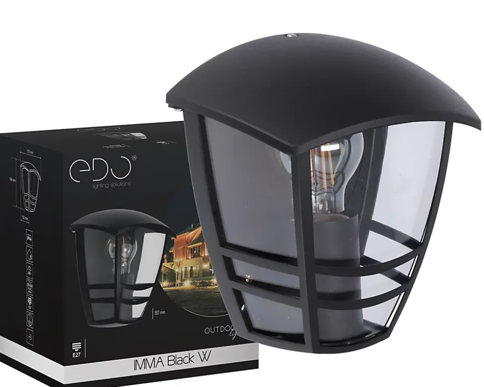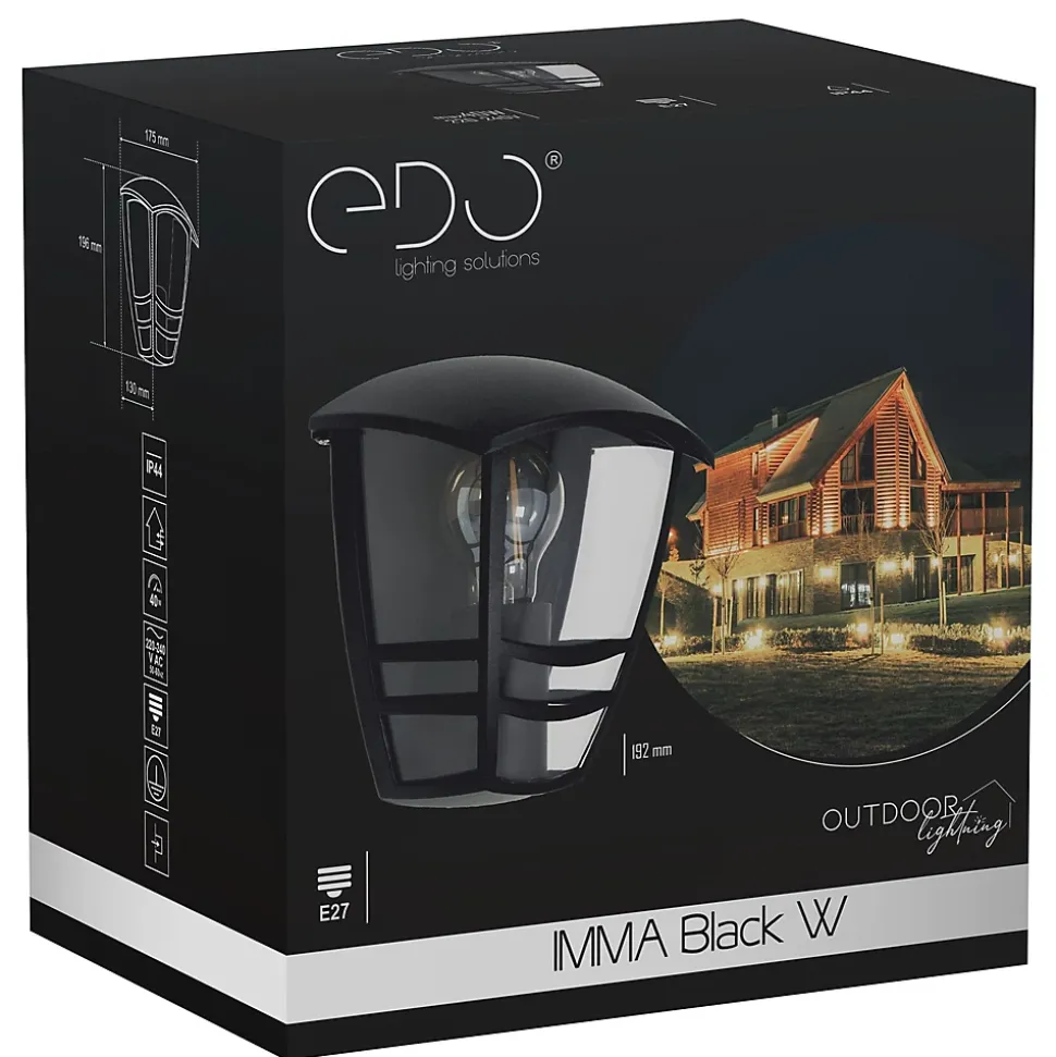Luminaire de façade pour jardin, applique murale extérieure IMMA BLACK W E27 noir IP44 EDO777379 EDO SolutionsIMMA vous séduira par sa simplicité et son élégance. Son boîtier noir sablé aux formes minimalistes s’intégrera parfaitement à tous les aménagements extérieurs, des plus modernes aux plus classiques. Dimensions [mm] : ✔️hauteur de l’abat-jour : 196 mm✔️largeur de l’abat-jour : 175 mm✔️profondeur de l’abat-jour : 130 mm✔️hauteur totale : 196 mm✔️largeur totale : 175 mm✔️profondeur totale : 130 mmSpécifications techniques:✔️ Puissance : 40 W✔️ Douille : incluse✔️ Source lumineuse : ampoule E27 (non incluse)✔️ Type de montage : montage en saillie✔️Type de raccordement : vis à vis ✔️Couleur : noir✔️Type de finition : sablé✔️Matériau du boîtier : aluminium✔️Matériau du cache : PVC✔️Réglable : non✔️Diffuseur : transparent✔️Douille incluse : oui✔️Type de douille : E27✔️Nombre de douilles : 1✔️Source lumineuse incluse : non✔️Tension nominale [V] : 220-240 V CA ✔️Fréquence nominale [Hz] : 50-60 Hz✔️IP : IP44✔️Classe de protection : II