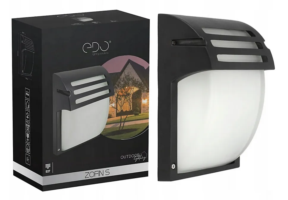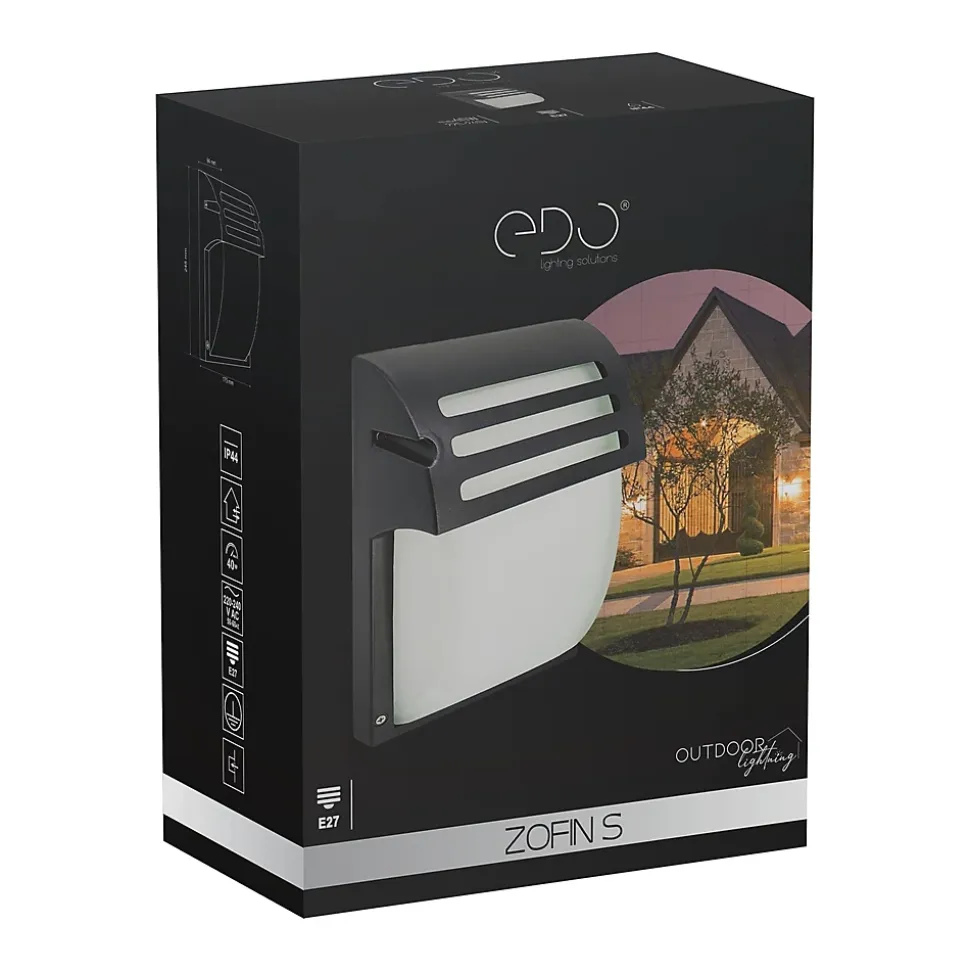 Lampe de jardin pour façade, applique murale ZOFIN S, IP44, E27, 220-240V, noir EDO777373 EDO Dans le confort de votre propre jardin, vous pouvez parfaitement vous ressourcer après une dure journée de travail ou passer un moment agréable avec vos proches. Il vaut la peine d’adapter son éclairage afin que ces moments soient encore plus agréables.DONNÉES GÉNÉRALES ✔️Utilisation : à l’extérieur ✔️Type de montage : en saillie ✔️Lieu de montage : mur ✔️Type de raccordement : vis à vis ✔️Couleur : noir ✔️Type de finition : sablé ✔️Matériau du boîtier : aluminium, acier ✔️Matériau du cache : verre ✔️Réglable : non ✔️Cache : mat ✔️Type de douille : E27 ✔️Nombre de douilles : 1 ✔️Source lumineuse incluse : nonCARACTÉRISTIQUES TECHNIQUES ✔️Puissance max [W] : 40 W ✔️Tension nominale [V] : 220-240 V CA ✔️Fréquence nominale [Hz] : 50-60 Hz ✔️IP : IP44 ✔️Classe de protection : I ✔️Teneur en mercure : non ✔️Distance minimale par rapport à l’objet éclairé [m] : 0,5 m ✔️Conditions ambiantes : -30…50 °CDimensions [mm] : ✔️Hauteur du diffuseur : 245 mm ✔️Largeur du diffuseur : 175 mm ✔️Profondeur du diffuseur : 94 mm ✔️ Hauteur totale : 245 mm ✔️Largeur totale : 175 mm ✔️Profondeur totale : 94 mm