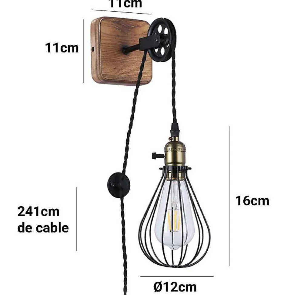 Lapplique murale FRUSTA présente un design classique et vintage qui ajoute une touche délégance intemporelle à tout espace. Avec sa structure en fer et sa cage cette applique offre un style rétro charmant parfait pour compléter à la fois les maisons et les commerces. Cet applique est idéal pour éclairer les chambres les salons les couloirs les studios les bureaux et plus encore grâce à son design polyvalent et fonctionnel. La poulie intégrée permet dajuster la hauteur de la lampe selon les besoins déclairage et de décoration. Caractéristiques principales Puissance maximale 40W. Câblage de 241cm avec prise et interrupteur pour une installation facile. Nécessite une ampoule E27 non incluse pour fonctionner. Matériau Fabriqué en bois et en métal de haute qualité pour une durabilité et une résistance accrues. Design vintage classique qui ajoute une touche de nostalgie et de style à nimporte quel environnement. Lapplique murale FRUSTA est un choix parfait pour ceux qui recherchent un éclairage avec du caractère et un design vintage qui ne se démode jamais.