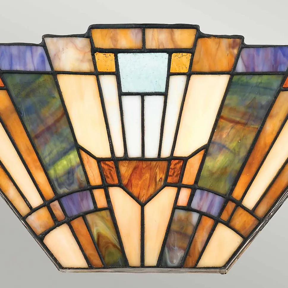 Ce style Arts and Crafts présente un abat-jour pyramidal avec une bordure en escalier pour plus d’intérêt visuel. Le design géométrique classique comprend du verre d’art dans des tons d’ambre, de crème et de tan, accentué par des pièces de verre en bleu saphir et en vert riche. Les détails géométriques linéaires de la base complètent parfaitement l’abat-jour.