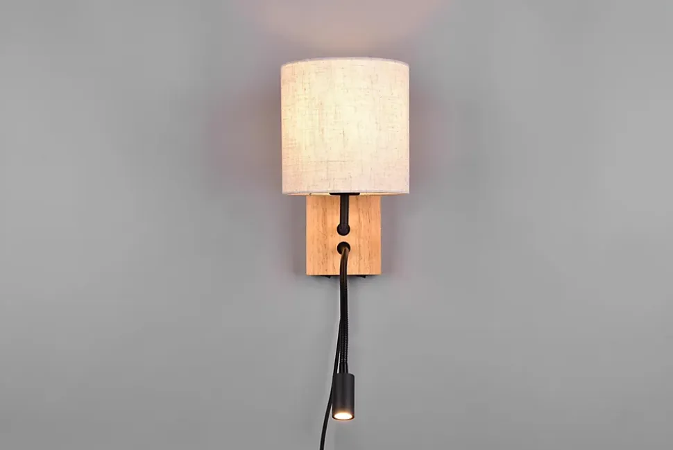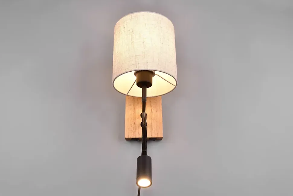 Les caractéristiques techniquesL’applique murale NILAM de Trio associe deux fonctions d’éclairage complémentaires dans un design naturel et élégant. Elle se compose d’un abat-jour cylindrique en tissu blanc pour une lumière d’ambiance douce, et d’un bras liseuse LED orientable pour un éclairage direct et ciblé.La liseuse est équipée d’une LED SMD de 3,1 watts, diffusant 310 lumens avec une température de couleur de 3000 kelvins. Elle peut être activée séparément grâce à un interrupteur dédié sur le corps de la lampe. De même, l’éclairage principal fonctionne avec une ampoule E27 (non incluse), jusqu’à 28W, également contrôlée par un interrupteur indépendant.Grâce à la technologie FLEXconnect, cette applique peut être installée en fixation murale classique ou utilisée avec un cordon de raccordement.Les avantages esthétiquesCe modèle séduit par ses matériaux naturels et sa ligne épurée. Le bois clair non traité apporte une touche chaleureuse et authentique, tandis que le tissu blanc assure une diffusion douce de la lumière. C’est le luminaire parfait pour créer une ambiance cosy dans la chambre ou en coin lecture.En intégrant une LED économe en énergie et durable, l’applique NILAM permet de réduire votre consommation électrique tout en garantissant une longue durée de vie du produit.