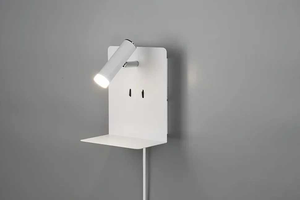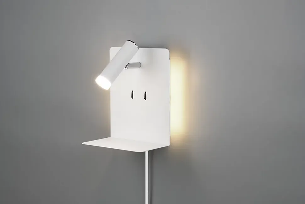 Les caractéristiques techniquesL’applique murale LED Element de TRIO associe sobriété et fonctionnalité. Fabriquée en métal blanc mat, elle propose une lumière principale de 220 lumens (3W) et deux liseuses de 150 lumens chacune (1,5W). Chaque source lumineuse peut être commandée séparément grâce à ses interrupteurs intégrés.Dotée d’un port USB pour recharger facilement vos appareils et d’une étagère pratique, cette applique est parfaite en tête de lit ou dans un espace détente. La fonction FLEXconnect permet un branchement direct ou via un cordon de raccordement.Elle est conçue pour un usage en intérieur avec un indice de protection IP20 et offre une grande longévité (30 000 heures), tout en étant éco-énergétique.Les avantages esthétiquesGrâce à son design minimaliste et intemporel, cette applique s’intègre harmonieusement dans tout style de décoration. Sa couleur blanc mat apporte une touche épurée et élégante qui s’adapte facilement à tous les environnements.La liseuse orientable offre un confort optimal pour la lecture, et la tablette intégrée ajoute une praticité moderne pour poser livres ou accessoires. Un choix parfait pour optimiser l’éclairage et le rangement dans un espace réduit !En plus de ses atouts esthétiques, la technologie LED intégrée garantit jusqu’à 80 % d’économies d’énergie par rapport aux luminaires traditionnels, tout en respectant l’environnement.
