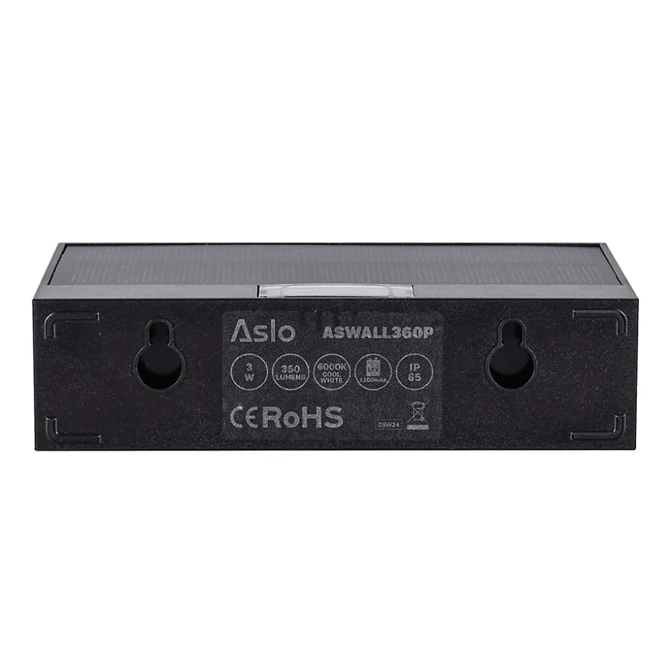 Applique murale d’extérieur LED Couleur NOIRE alimentation Solaire ASLO. Type de LED : LED SMD 2835 – 21 unités. Puissance / Lumens : 3W / 350Lm. Détecteur infrarouge avec angle de faisceau : 140° et 70º double faisceau. IP65 IK04. Batterie 18650 Li-ion 3,7V, 1200mAh. Batterie remplaçable. Temps de charge : 5-6h. Autonomie (pleine charge) : 35h. Zone de détection : max 6m. Hauteur d’installation : 2-4m. Plage de détection : 120º. Zone éclairée : 50m².