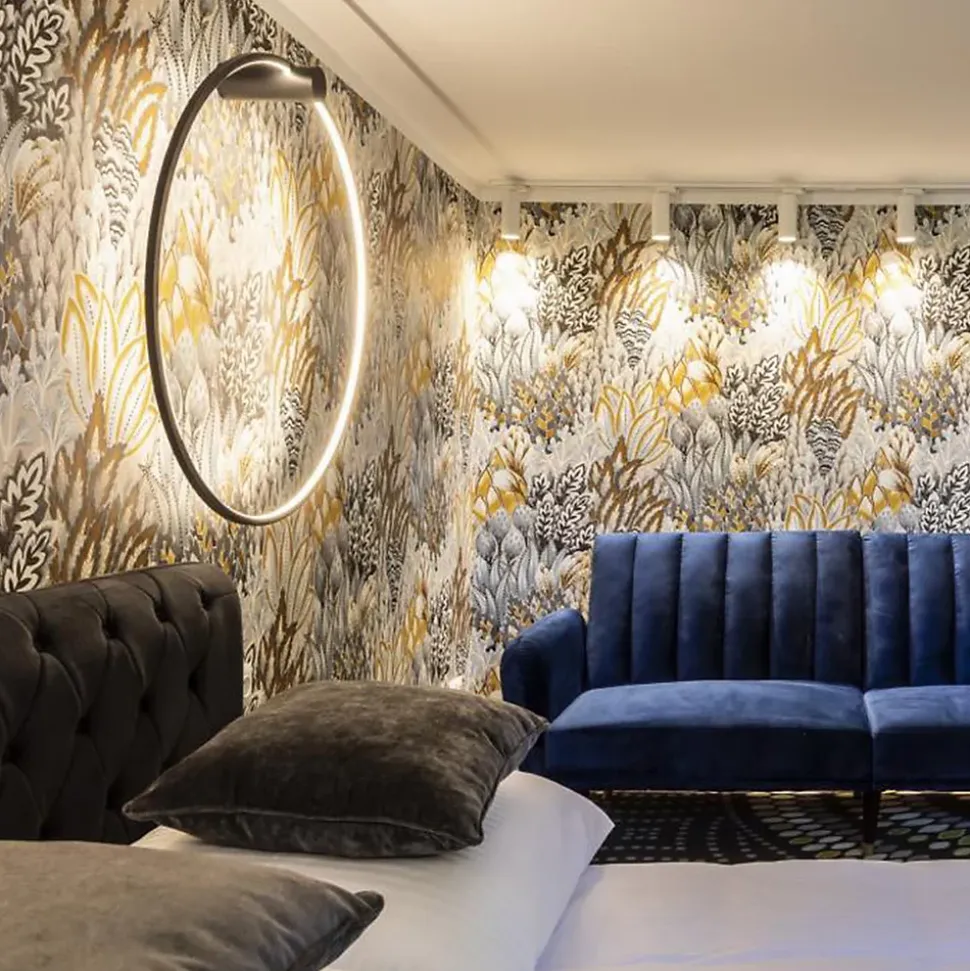 Applique murale miroir en métal noir avec source lumineuse LED CCT intégrée et indice de protection IP44.