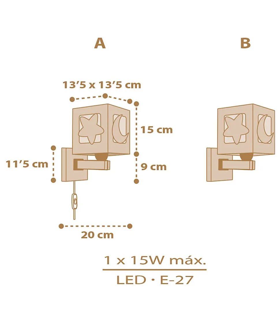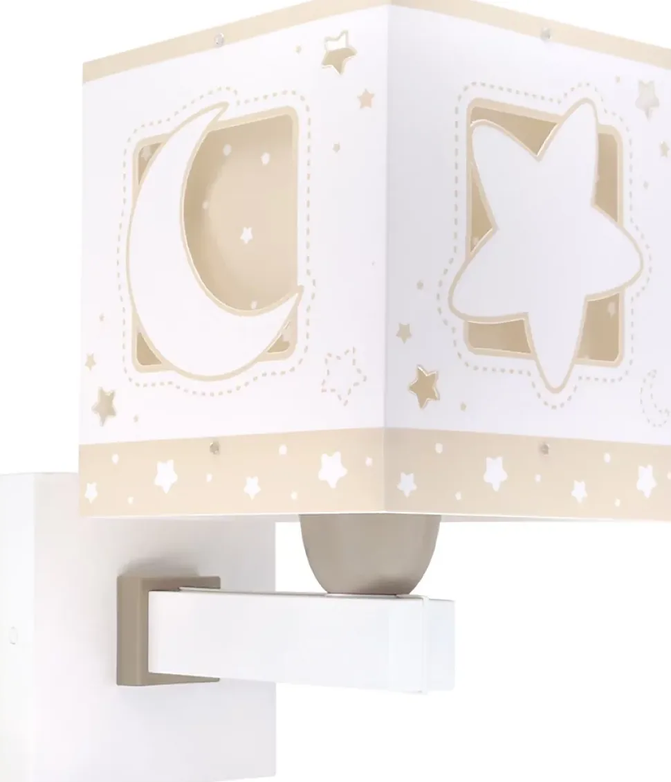 Applique murale pour enfant Moonlight lune et étoiles de couleur beige Double affichage, installation filaire et sans fil avec interrupteur et étoiles et lune brillent dans le noir.