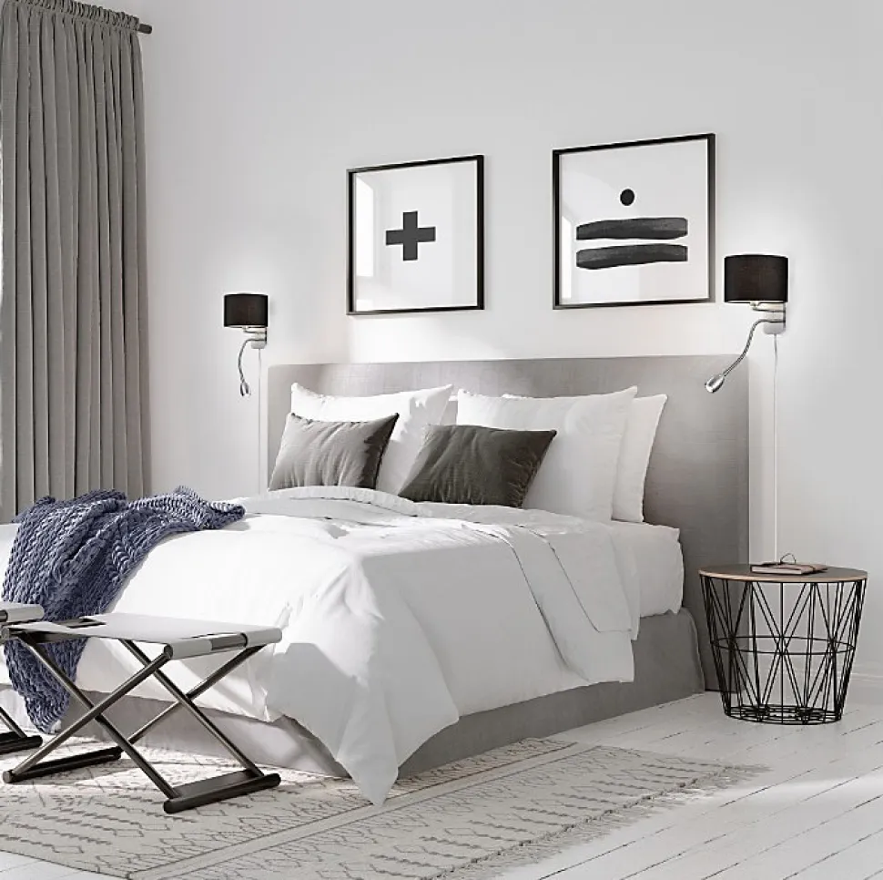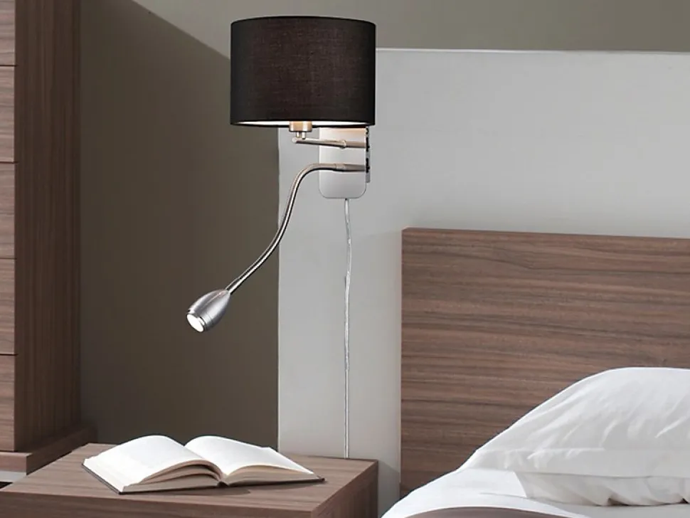 Un éclairage 2-en-1 parfait pour la chambreL’applique murale HOTEL de TRIO est idéale pour créer une ambiance chaleureuse et fonctionnelle dans votre chambre. Avec son abat-jour en tissu noir et son design classique, elle diffuse une lumière douce et agréable, parfaite pour une atmosphère cosy.Une liseuse orientable pour vos lecturesEn plus de son éclairage principal, cette applique est équipée d’un spot LED flexible situé en bas du luminaire. Ce petit projecteur réglable est idéal pour un éclairage ciblé pendant vos lectures du soir, sans déranger votre partenaire.Design élégant et pratiqueConçue pour une utilisation intérieure, l’applique HOTEL s’intègre facilement dans une chambre, une tête de lit ou un coin lecture. Son interrupteur intégré la rend particulièrement pratique à utiliser au quotidien.Caractéristiques principalesÉclairage mixte : lumière ambiante + liseuse orientableAbat-jour en tissu pour une lumière douce et diffuseDesign sobre et élégant pour tous les styles d’intérieurInterrupteur pratique directement sur l’appliqueIdéale pour chambre ou tête de lit