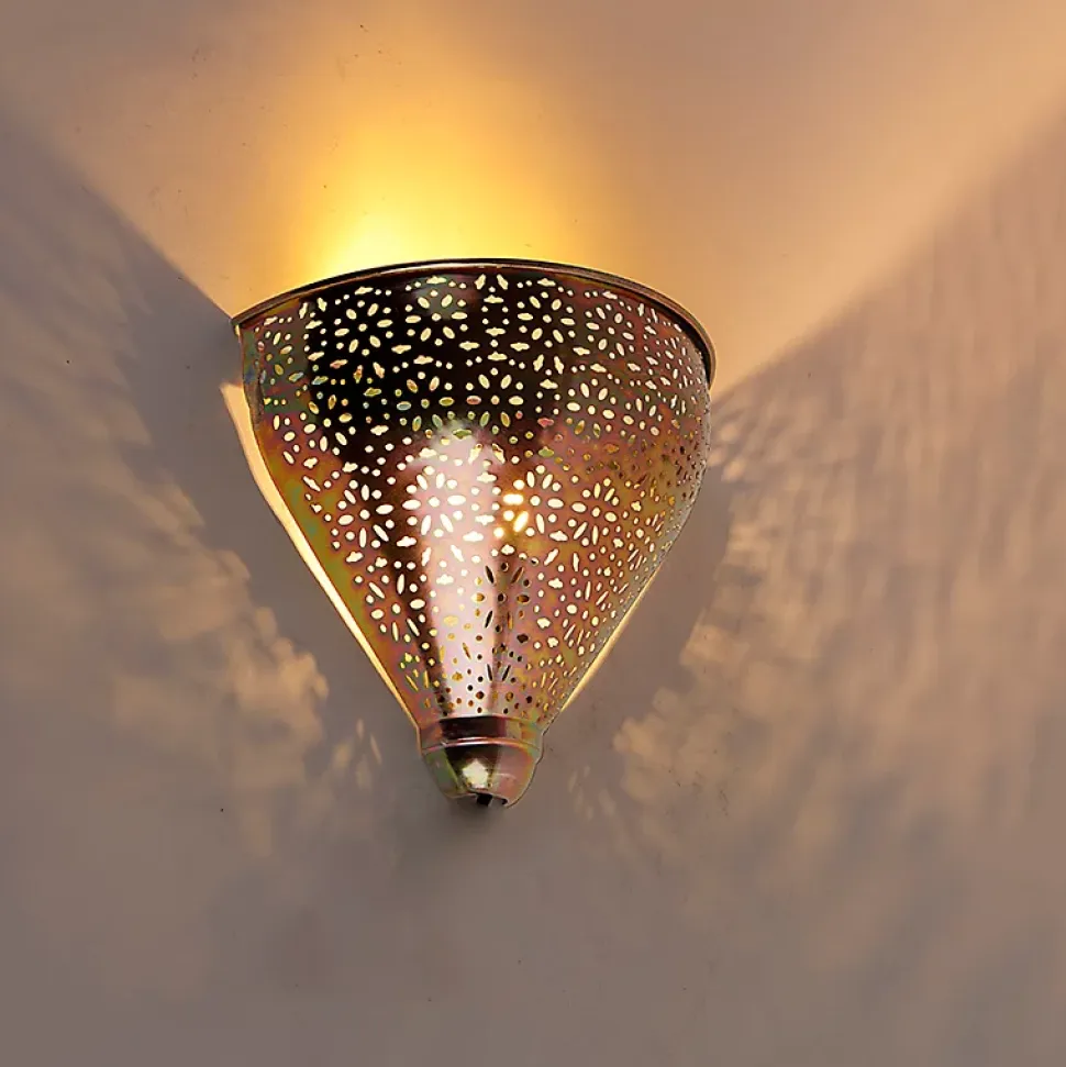 Une applique en cuivre à la finition magnifique et au design unique. Son abat-jour ouvert crée un beau jeu de lumière sur le mur et le plafond. Elle est un véritable atout pour le salon ou le couloir. Elle crée également une atmosphère cosy dans la chambre à coucher. Elle mesure 20 cm de haut et 25 cm de long. Sa profondeur est de 11,5 cm. Complétez votre Muraf avec une ampoule E14 (40W maximum). L’ampoule n’est pas incluse. Vous pouvez atténuer la lumière de l’applique avec un variateur externe. Apportez une atmosphère orientale et cosy à votre intérieur avec notre Muraf !