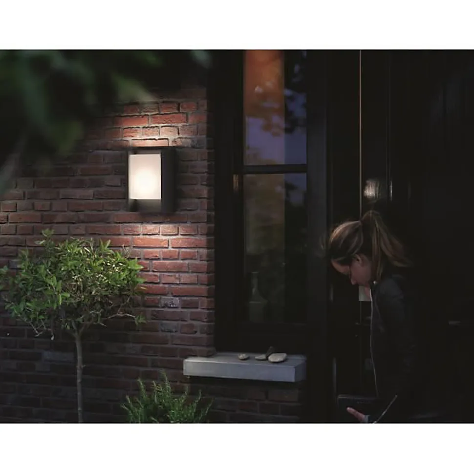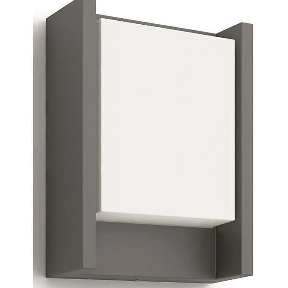 Applique murale extérieure LED Philips Arbour en métal gris anthracite au design moderne et minimaliste. Module LED intégré 6W (~600 lm, 4000 K) pour un éclairage blanc neutre et homogène avec effet lavis doux vers le bas. Indice IP44 résistant aux projections d’eau, adaptée pour porches et entrées. Diffuseur blanc opaque pour une lumière uniforme, finition mate sans vis apparentes. Durée de vie ~25 000 h. Garantie fabricant 2 ans.