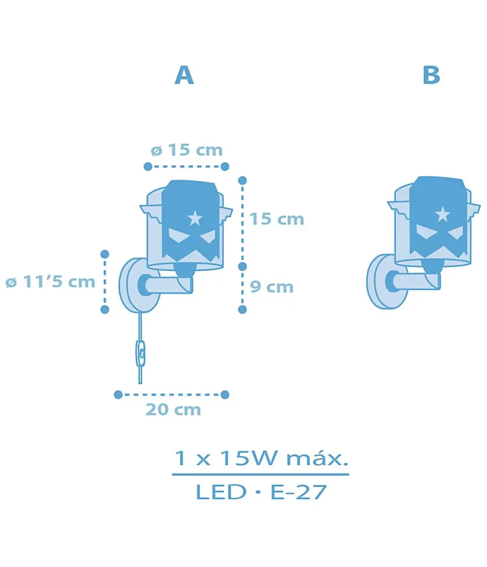 Applique murale pour enfants Blue Hero. Éveillez votre courage et votre imagination avec ce super-héros et transformez chaque nuit en une aventure épique. Fabriqué avec double écran en polypropylène transparent. Brille dans le noir ! Installation avec ou sans câble inclus.