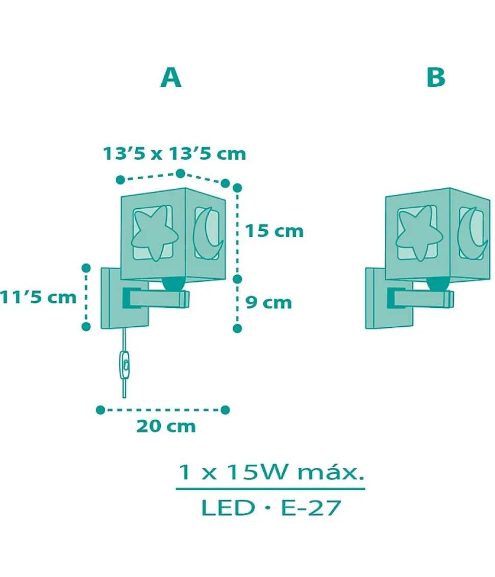 Applique murale pour enfant Moonlight lune et étoiles de couleur vert Double affichage, installation filaire et sans fil avec interrupteur et étoiles et lune brillent dans le noir.