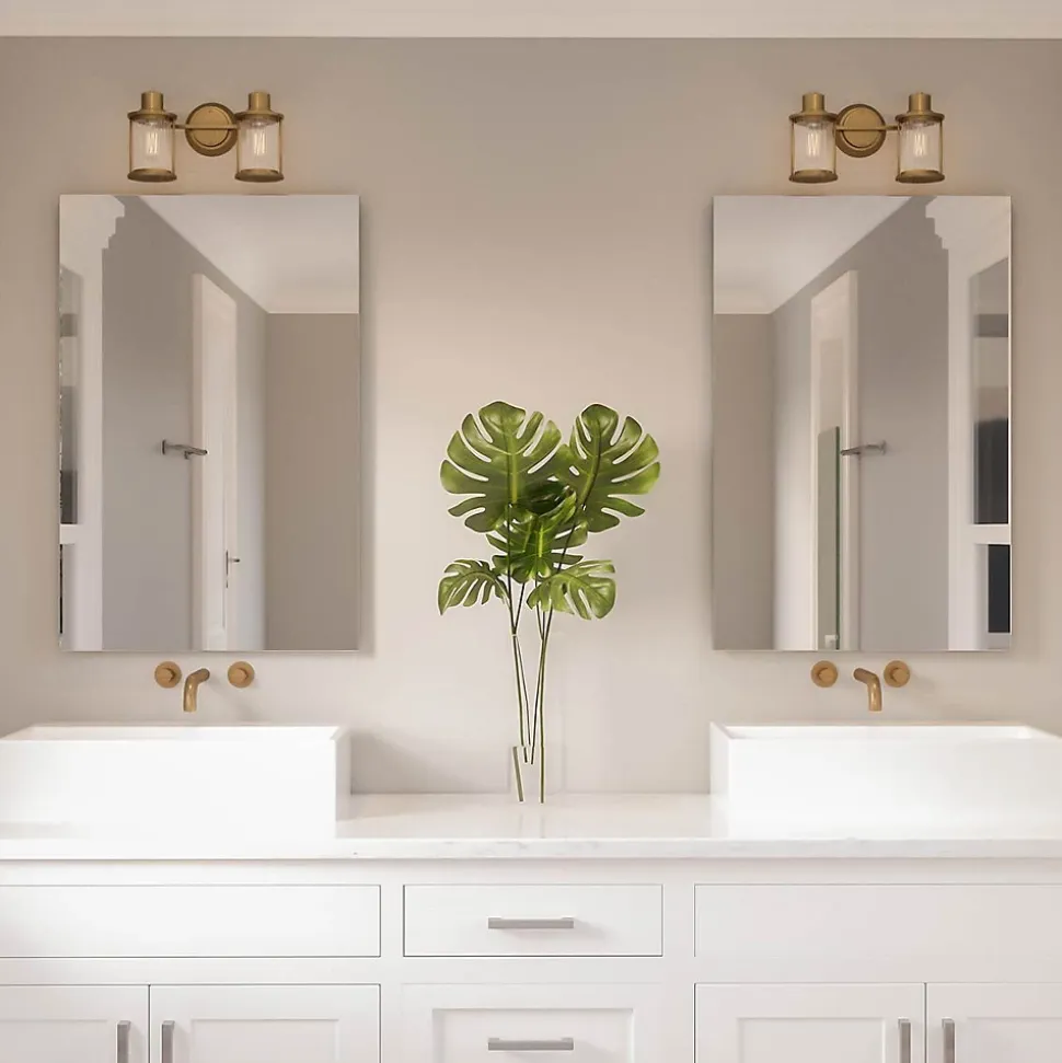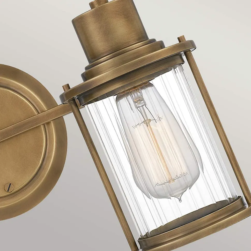 L’applique murale Riggs 2 lumières est finie en laiton vieilli, avec un verre strié transparent. Elle a un aspect industriel léger et est conforme à la norme IP44 pour les salles de bains.