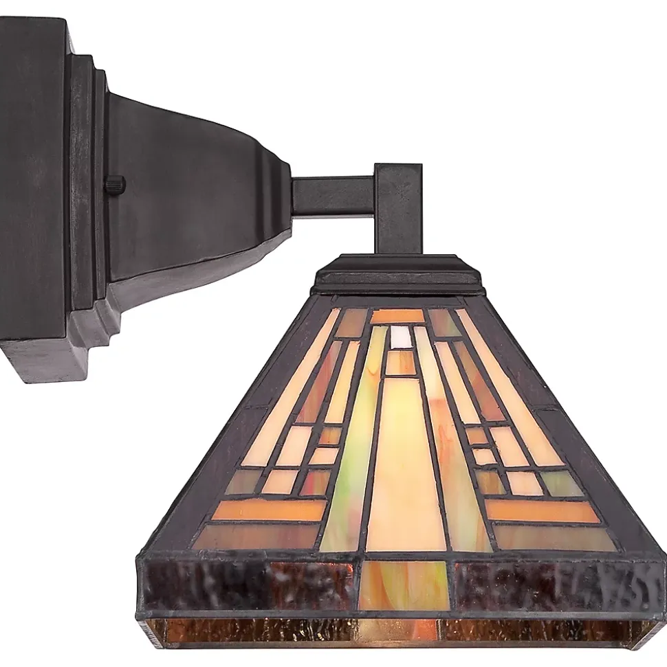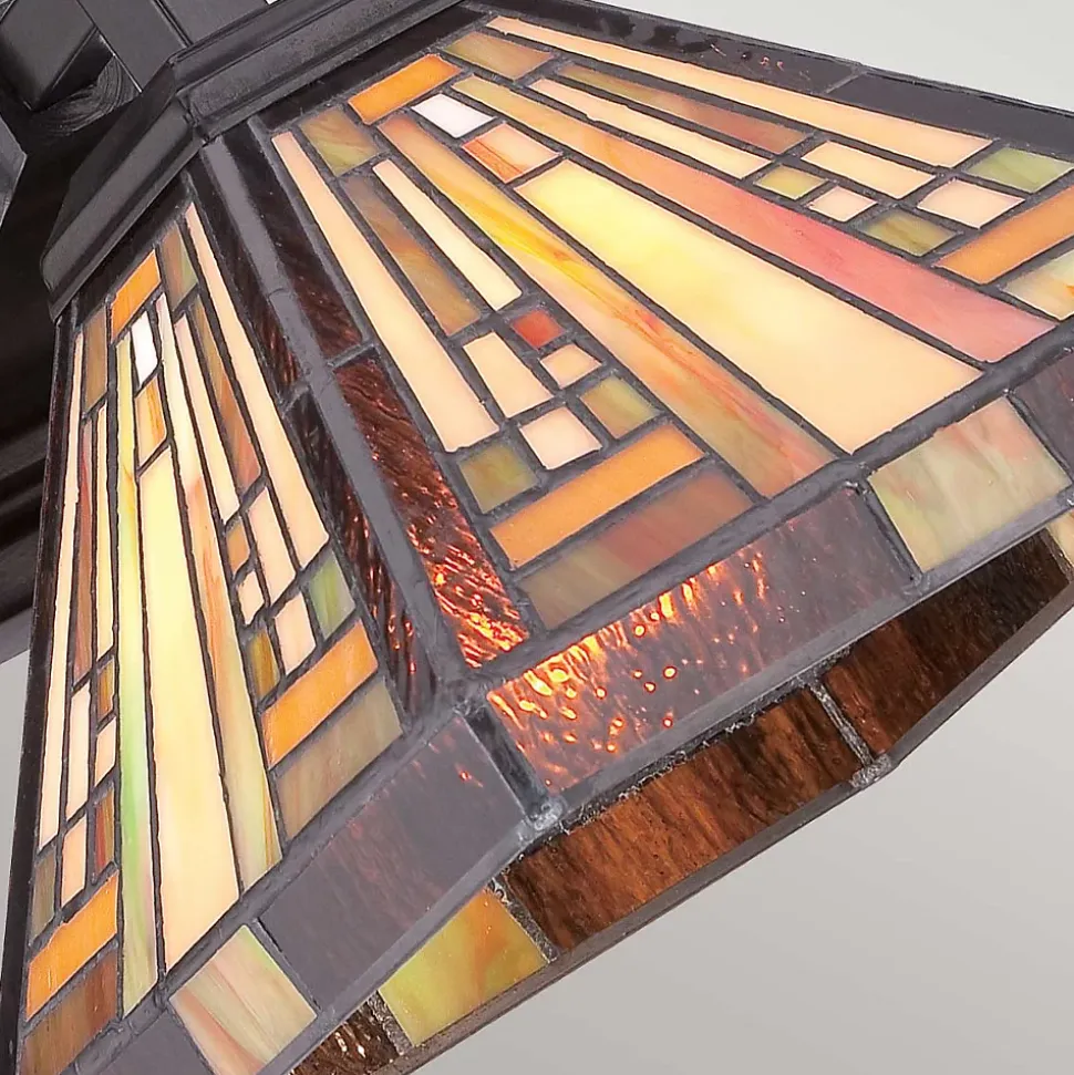 Cette collection de style Tiffany fabriquée à la main illumine votre intérieur avec des nuances chaudes d’ambre, de bisque et de vert terreux, disposées selon un motif géométrique simple et net rappelant les œuvres de Frank Lloyd Wright. La base robuste complète le style Arts & Crafts, et est finie en bronze vintage.
