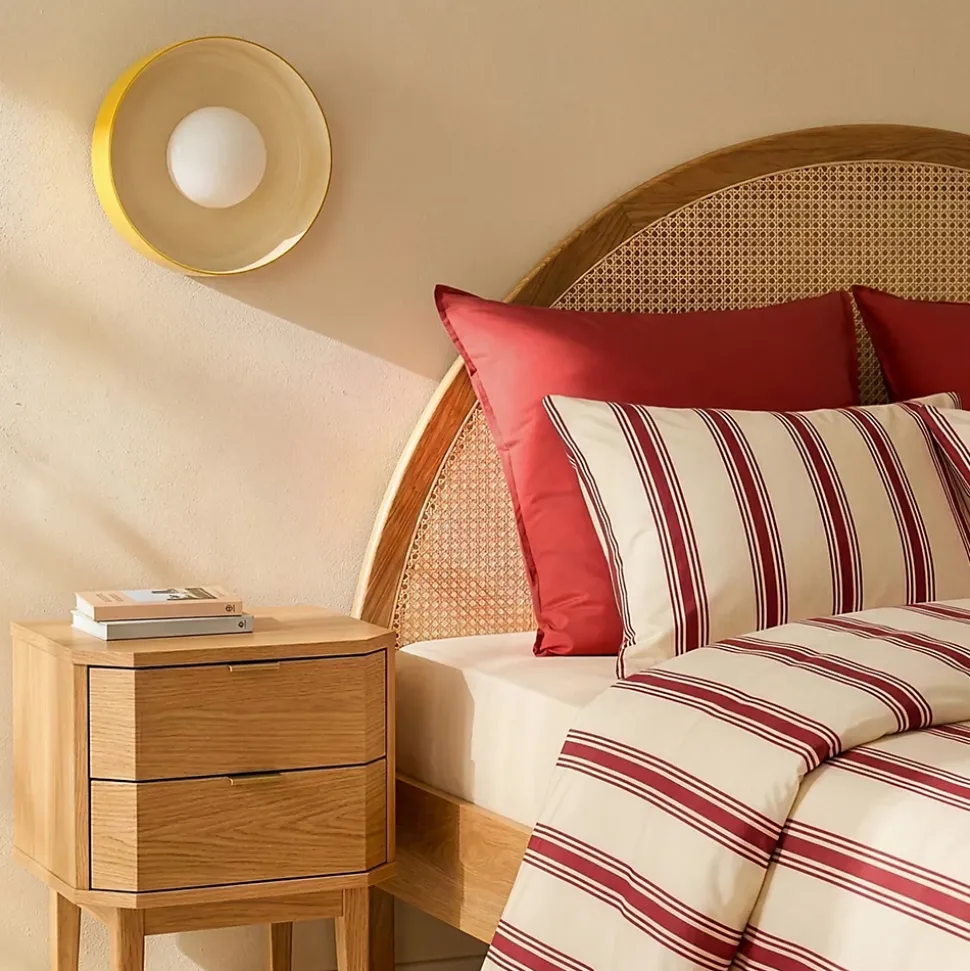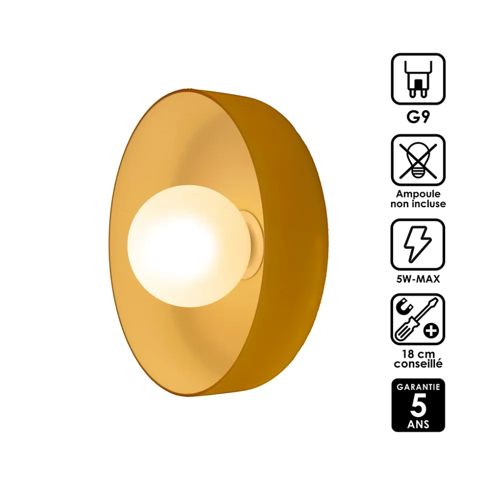 Illuminez vos murs avec l’applique murale Yori, un modèle qui allie forme géométrique nette et contraste de couleurs vibrantes. Sa silhouette moderne apporte une présence graphique dans n’importe quelle pièce, tout en restant raffinée et élégante. Même éteinte, cette applique attire l’œil et transforme vos murs en véritables éléments décoratifs. La sphère en verre opalin diffuse une lumière homogène et agréable, idéale pour créer une ambiance intimiste dans un couloir, un salon ou derrière un canapé. Le réflecteur coloré apporte un effet lumineux subtilement doré, qui valorise la décoration environnante et enrichit l’atmosphère de la pièce.