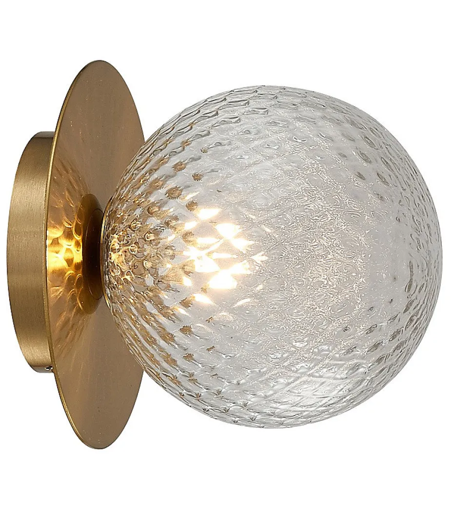 Applique murale verre et métal MarquiseL’applique MARQUISE a vraiment un charme fou. Elle est composée d’une délicate feuille de métal ronde et d’une sphère en verre texturé qui diffuse la lumière avec de charmants reflets. La combinaison des matériaux est particulièrement réussie et la subtilité des jeux de lumière font de cette applique un superbe élément de décoration. L’applique MARQUISE donne beaucoup d’élégance et de style à une chambre ou un couloir par exemple.