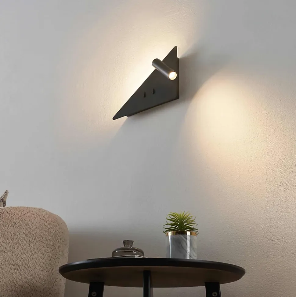 Le modèle Elaris type A associe design géométrique affirmé et confort lumineux. Son triangle en métal noir intègre une liseuse LED orientable et un éclairage d’ambiance doux, chacun contrôlable via son interrupteur dédié. L’angle droit, situé à droite, le rend parfait pour créer un duo symétrique avec la version type B. À installer seul ou en miroir, pour un éclairage mural à la fois décoratif et pratique.) Livré monté, prêt à installer (