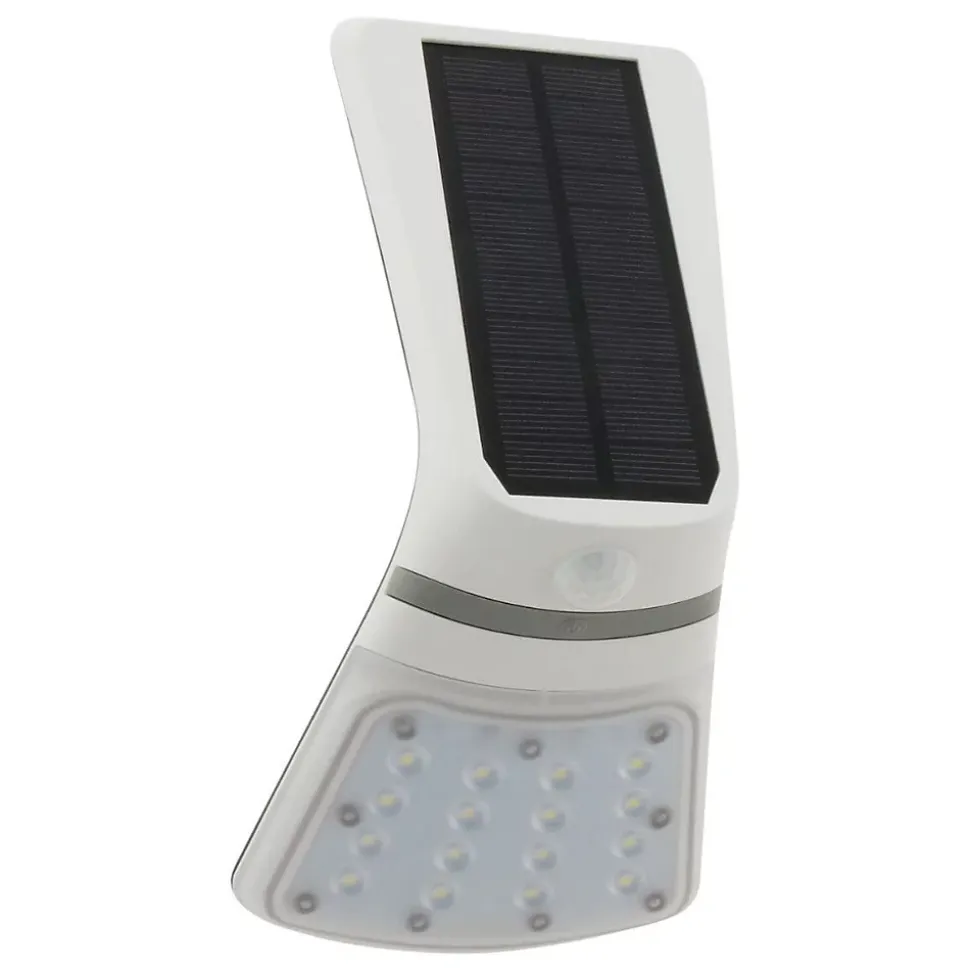 Applique solaire LED + détecteur de mouvement. Couleur(s) : blanc. Puissance : 2W. Intensité lumineuse : 240lm. Indice de protection : IP65. Nombre de LEDs : 16 à l’avant. Angle de détection : 120°. Portée : 6 mètres. Autonomie : 5h. Temps de charge : 7h. Batterie : LI-ion 3,7V 1200mAh. Interrupteur : Off / Auto
