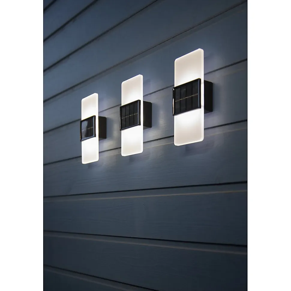 Applique murale à énergie solaireCette référence existe également en lot de 2, en lot de 4 et en lot de 6 avec des prix dégressifs, voir les pages respectives.Matière : ABS / acryliqueNombre de Lumens : Durée maximum d’éclairage : 8 heuresInterrupteur blanc froid / off / blanc chaudFixation par vis fournis LED : 12 LED SMD (6x blanc chaud + 6x blanc froid)Batteries rechargeables : 1 x 600mAh Ni-Mh AAADimensions produits : (voir le schéma technique parmi les images)Longueur : 60 -Profondeur : 30 -Hauteur : 140 mm