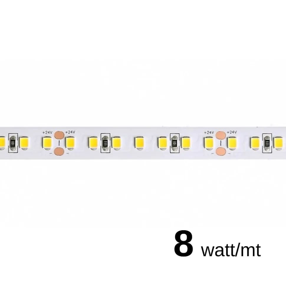 Ruban LED de 8 watt/mètre alimenté en 24V, excellente luminosité, c’est le ruban utilisé pour les grandes applications. Ce type de bande convient à tous les endroits où un faisceau lumineux modéré est nécessaire. Chaque bande LED doit être appliquée sur un profilé en aluminium pour dissiper la chaleur et prolonger la durée de vie de la bande LED.Cette réglette LED possède un angle d’ouverture lumineuse grâce auquel il est possible d’avoir une lumière à 120°, avec un faisceau assez répandu.Où puis-je placer ma bande LED de 8 watts/mètre ?Il s’agit d’un ruban LED avec un dos adhésif (adhésif 3M), indispensable pour coller le ruban LED sur un profilé aluminium et dissiper sa chaleur. Le ruban LED de 8 watt/mètre trouve son application sous les éléments hauts des cuisines. Il est également utilisé comme éclairage principal dans les profilés encastrés en plaques de plâtre dans des environnements où une lumière intense n’est pas nécessaire.Il existe également différents profilés en aluminium pour les différentes applications de la bande LED, nous avons le profil à encastrer en plaques de plâtre, le profil d’angle à 90°, le profil praticable, le profil rond, le profil classique pour créer des tiges sous les éléments hauts et enfin la bande plate. d’aluminium utilisé pour installer la bande LED dans les couvercles en plaques de plâtre.ICI vous pouvez trouver tous les profilés en aluminium disponibles.Ce type de bande LED ne peut être utilisé qu’à l’intérieur, en effet elle possède un indice de protection IP20.Sur notre site, vous pouvez trouver des bandes avec un degré de protection plus élevé, adaptées à l’extérieur. La bande LED nécessite une alimentation de 24 Volts, elle nécessite donc une alimentation, que vous pouvez trouver ICI. Chaque bande LED est dimmable, ce qui signifie qu’il est possible de faire varier l’intensité de la lumière avec les contrôleurs avec télécommande appropriés que vous pouvez trouver ICI