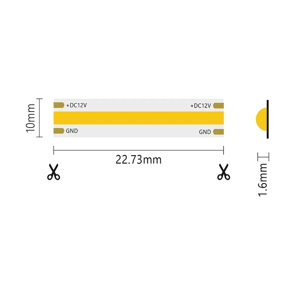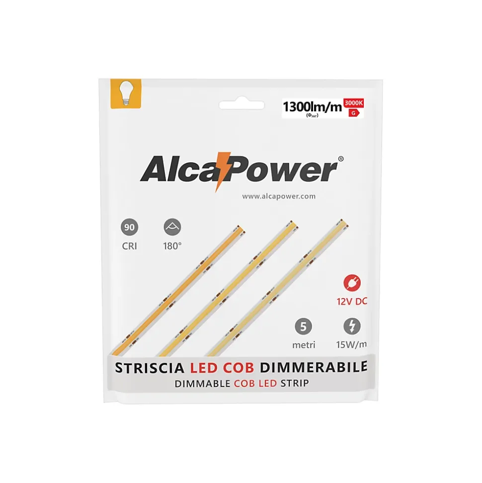 Bande LED COB monochromatique de 5 m, 15 watts/mètre, connexion 12 V. Excellente luminosité.La bande LED COB monochrome est une bande LED de nouvelle génération, en effet elle permet d’avoir une seule ligne de lumière, éliminant les > gênants pour l’œil. La bande LED COB monoculaire est disponible en trois couleurs de lumière : bande LED COB à lumière chaude (3000K), bande LED COB à lumière naturelle (4000K) et bande LED à lumière froide (6500K). Cette réglette LED possède un angle d’ouverture de lumière grâce auquel il est possible d’avoir une lumière à 180°, avec un faisceau assez répandu.Où puis-je placer ma bande LED colorée 15W/m ?Il s’agit d’une bande LED de 15 W/m adaptée à tout type d’application interne ou externe. Cette bande LED avec indice de protection IP65 est pliable et peut être utilisée pour éclairer des environnements résidentiels ou de travail, et est également utilisée pour éclairer les jardins, les parterres de fleurs, les cours et les espaces extérieurs en général.Flux lumineux de la bande LED COB lumière chaude (3000K) : 1300lm/mFlux lumineux de la bande LED COB lumière naturelle (4000K) : 1400lm/mFlux lumineux de la bande LED COB lumière froide (6500K) : 1500lm/mCe modèle de bande LED possède un indice de protection IP65 qui le rend adapté aussi bien à un usage externe qu’interne. La bande LED COB monochrome est alimentée en 12 Volts, elle nécessite donc une alimentation.Chaque bande LED est dimmable, ce qui signifie qu’il est possible de faire varier l’intensité de la lumière avec les contrôleurs avec télécommande appropriés que vous pouvez trouver ICI. La bande LED COB 12V peut être coupée tous les 2,2 cm. Si vous souhaitez faire plus de coupes, vous aurez peut-être besoin de quelques accessoires que vous pouvez trouver ICI