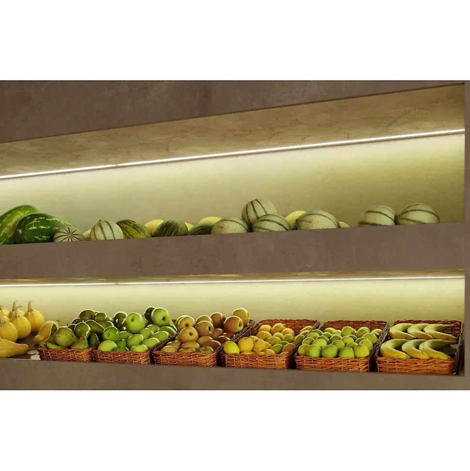 Bande LED conçue pour éclairer le comptoir de fruits et légumes, grâce à la température de lumière de 5000K.Notre bande LED professionnelle est équipée d’un adhésif haute résistance au dos, assurant une installation rapide et facile même sur des profilés en aluminium.Avec des dimensions de 10 mm de large et 1,5 mm d’épaisseur, la bande est fournie en bobine de 5 m et peut être coupée tous les 5 cm, ce qui permet de l’adapter facilement à vos besoins. Les bandes coupées peuvent être utilisées individuellement.Avec une tension d’entrée de 24 V en courant continu (DC), il est recommandé de calculer la puissance de l’alimentation en fonction de la longueur de bande souhaitée. Par exemple, pour alimenter une bande LED de 5 m à 15 W/M, une alimentation de 100W est recommandée.Cette bande LED remplace le tube LED ou NÉON pour comptoir alimentaire et offre plusieurs avantages :- Plus grande luminosité (à partir de 90Lm/W)- Lumière uniformeIdéal pour une installation dans les magasins d’alimentation et les supermarchés, en particulier dans les zones utilisées pour exposer des fruits et légumes frais.La bande LED doit être insérée dans un profilé aluminium, vous pouvez consulter les modèles compatibles ICI. Cette bande LED est vendue en bobines de 5 mètres et nécessite une alimentation 24V.Les bandes LED pour comptoir réfrigéré avec viandes et charcuteries, caractérisées par une teinte de 3 700K, rehaussent la fraîcheur et la vivacité de la viande. Pour le pain et le fromage, des bandes LED avec une lumière de 2700K font ressortir leurs couleurs distinctives. Pour les fruits et légumes, nous recommandons des bandes LED avec des nuances de 5000K pour des performances optimales tandis que pour les poissons, des bandes LED avec des nuances autour de 11 600 K.Marque : Beneito FauréVous pouvez retrouver les autres bandes LED alimentaires ICI