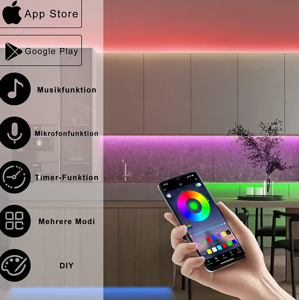 Contrôlez la bande LED intelligente 20M via l’APP « Lotus Lantern » ou la télécommande à 44 touches. Vous pouvez télécharger l’application via le code QR dans le manuel. Ensuite, vous disposerez de la bande LED avec 16 millions de couleurs, 15 modes de scène, différentes vitesses, variateur (1% -100%). Bande LED musicaleAvec le microphone intégré, la lumière peut changer en fonction des battements de la musique, de la vitesse du bruit ambiant. Il convient de mentionner en particulier les 4 niveaux de sensibilité de la musique. Cela permet de créer une ambiance adaptée aux jeux ou aux fêtes. Timing & fonction mémoireCes guirlandes musicales à LED offrent une fonction de timing permettant de définir un horaire approprié. La bande LED intelligente est également dotée d’une fonction mémoire qui permet d’enregistrer les derniers modes pour votre prochaine utilisation. La lampe LED peut être coupée sans endommager le reste de la bande. La bande LED autocollante peut être collée sur une surface sèche et plate et ne se décolle pas facilement. Large gamme d’applications La bande lumineuse LED est idéale pour la télévision, le jardin, les cadeaux de Noël, les clubs, les fêtes, les représentations théâtrales et les ambiances festives (mariage / anniversaire / fête / bar).