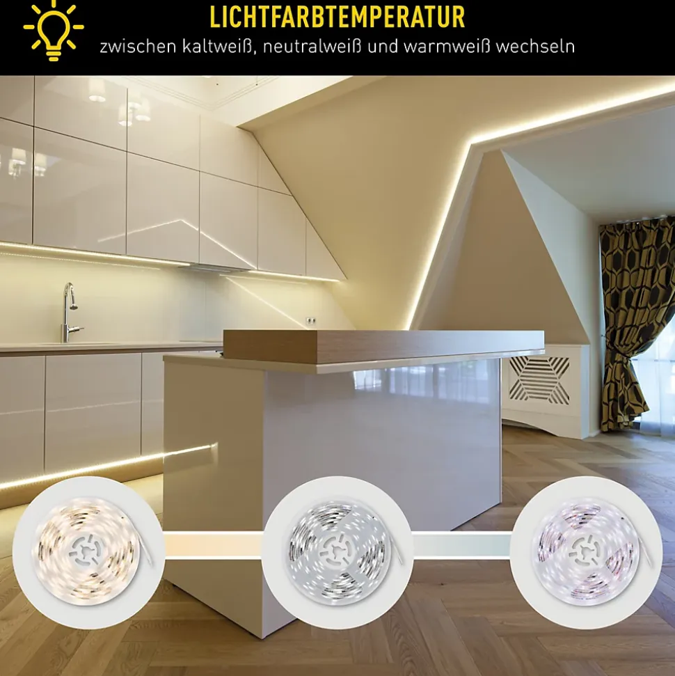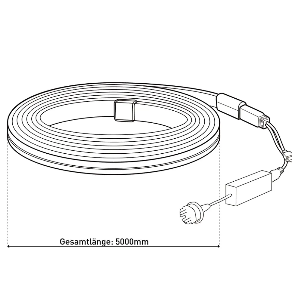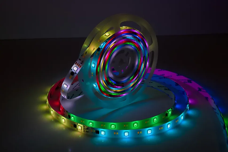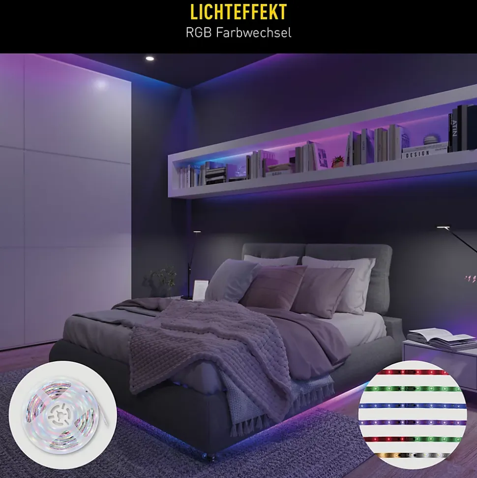 La bande LED RGB d’intérieur est une solution d’éclairage polyvalente et moderne pour l’intérieur. Avec une longueur de 5 mètres et une puissance totale de 24 watts, elle génère un flux lumineux pouvant atteindre 650 lumens et offre ainsi un éclairage à la fois fonctionnel et d’ambiance. Grâce à la fonction de changement de couleur RVB intégrée, il est possible de réaliser une grande variété de couleurs lumineuses, tandis que la fonction CCT supplémentaire permet un réglage individuel des tons blancs, du blanc chaud 3000 K au blanc froid 6500 K. La bande LED est dimmable et se commande facilement à l’aide de la télécommande IR à 44 touches fournie. Outre le réglage simple de la couleur et de la luminosité, différents scénarios d’éclairage sont disponibles, qui s’adaptent parfaitement à différentes ambiances et occasions. La fonction mémoire intégrée enregistre le dernier réglage sélectionné, tandis que la fonction minuterie offre un confort d’utilisation supplémentaire. Avec son design élancé d’environ 1,2 cm de largeur et 0,3 cm de hauteur, la bande LED peut être utilisée de manière discrète et flexible, par exemple pour un éclairage d’accentuation ou indirect. Le boîtier en plastique blanc s’intègre discrètement dans tous les intérieurs. La bande LED est conçue pour une utilisation en intérieur (IP20), fonctionne directement sur 220-240 V à 50 Hz et appartient à la classe de protection III. Le câble d’alimentation d’environ 150 cm permet une installation facile.