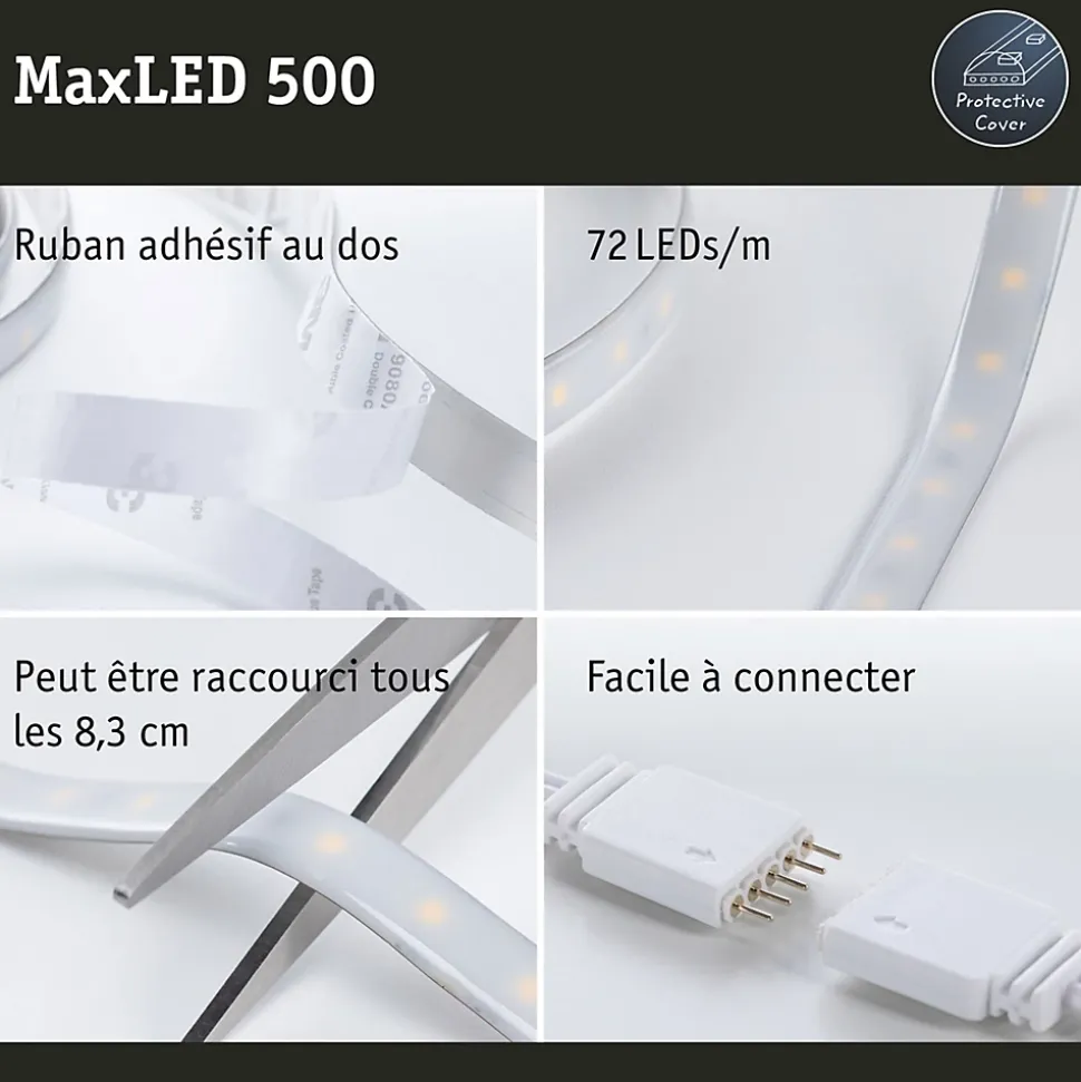 Ruban LED MaxLED RGBW 3 m – éclairage dimmable et multicolore avec LED blanche chaude, extensible jusqu’à 5 m, livré en set avec alimentation et télécommande IR pour une installation intérieure sécurisée.