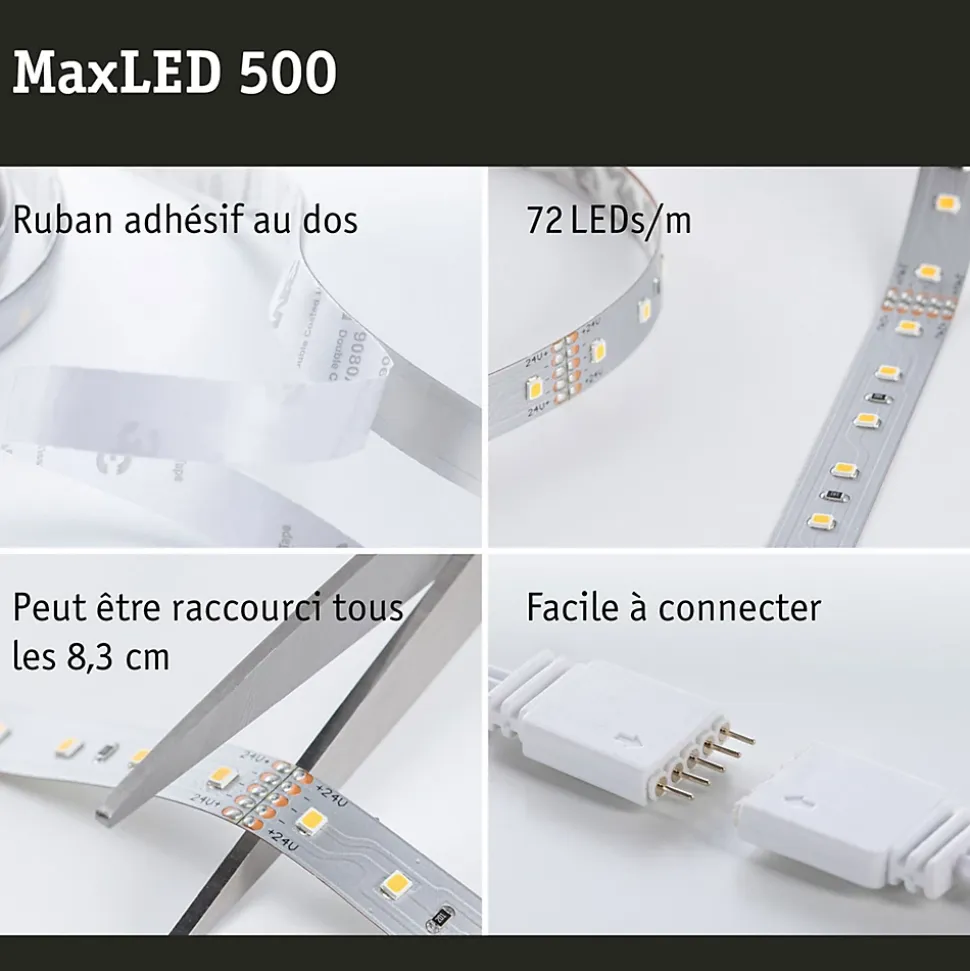 Prolongez facilement votre installation MaxLED 500 avec ce ruban LED extension 100 cm blanc lumière du jour 6500 K, autocollant et flexible, prêt à enficher grâce au connecteur mâle. Économie d’énergie 6 W et flux 550 lm pour un éclairage intérieur fonctionnel et d’ambiance, montage simple sans outils.