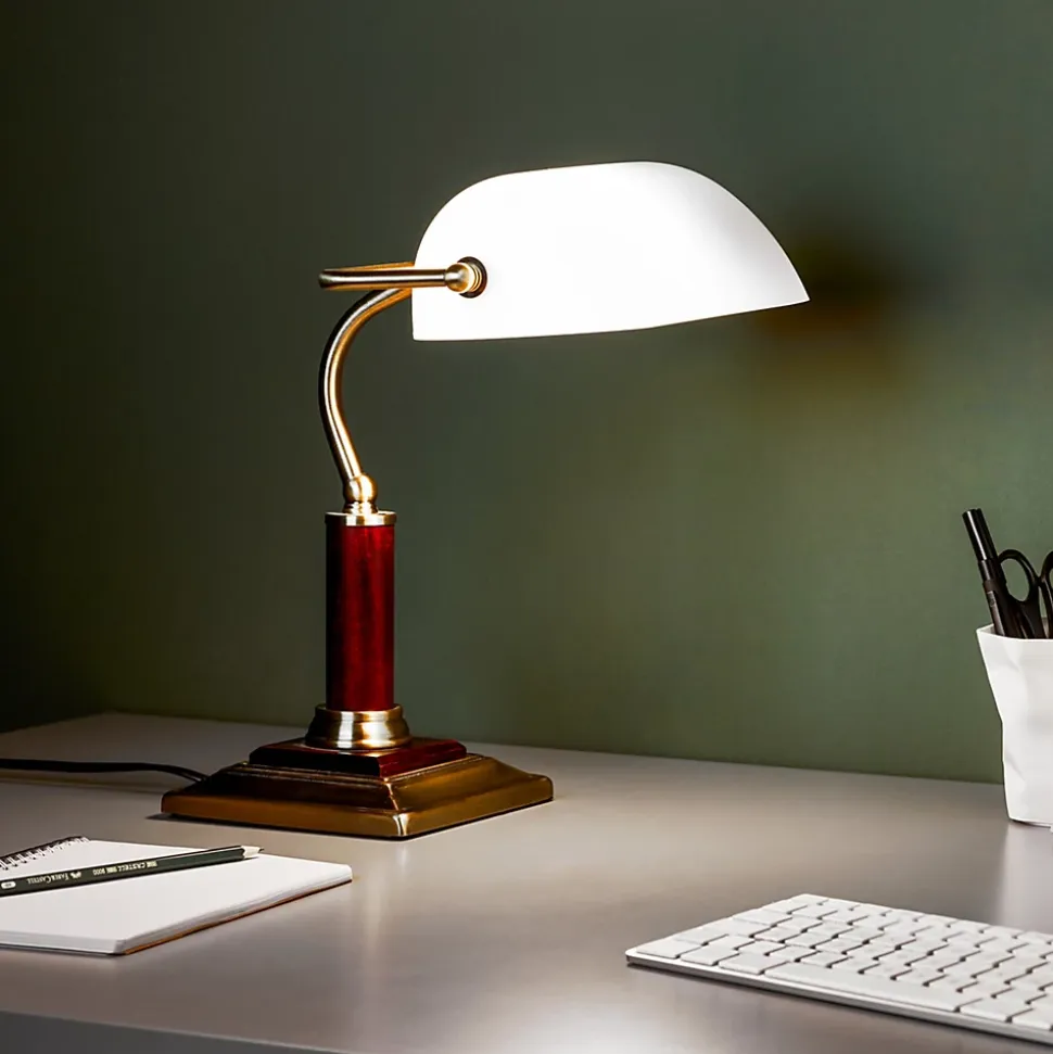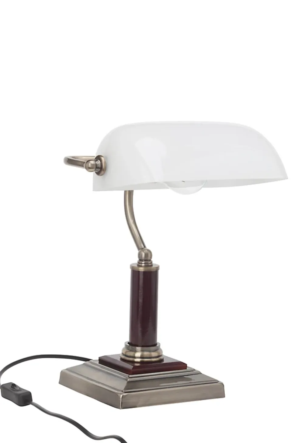 La lampe Bankir revisite un grand classique de la lampe de bureau avec une touche de modernité. L’association du laiton antique à des matériaux nobles comme le verre, le bois et le métal, en fait un objet aussi décoratif que fonctionnel. Avec son diffuseur orientable pour un éclairage directionnel, la lampe Bankir est idéale sur un bureau élégant, dans une bibliotèque ou encore une teble d’appoint de syle vintage. Ampoule non incluse.
