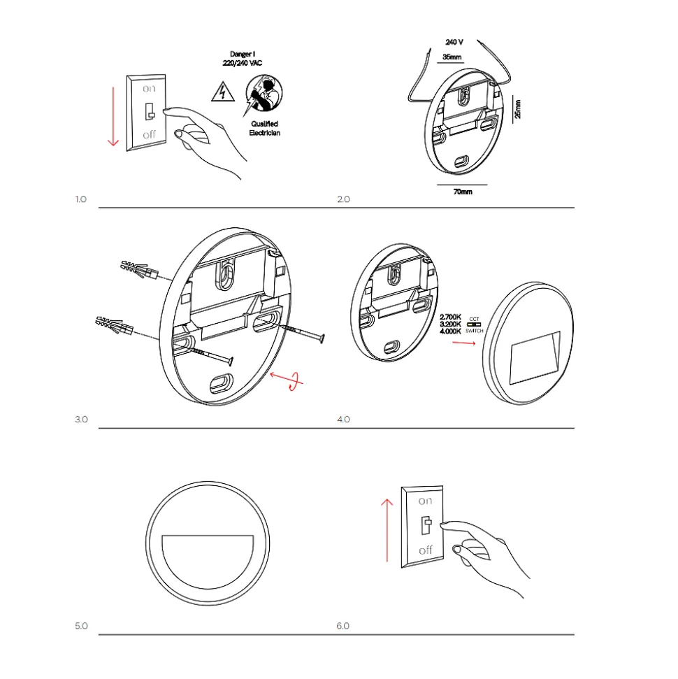 Doté de la technologie CCT Switch, ce spot permet de choisir la température de couleur entre 2 700 K, 3 200 K et 4 000 K grâce à un interrupteur intégré, s’adaptant ainsi à tous les besoins esthétiques et fonctionnels.Sa structure en polycarbonate résistant garantit d’excellentes performances grâce à son indice de protection IP65 contre l’eau et la poussière et sa résistance aux chocs IK06. Son corps fin (15 mm de profondeur) le rend idéal pour une installation dans des environnements architecturaux modernes, où élégance et discrétion sont essentielles.Idéal pour les maisons, les hôtels, les projets architecturaux et les espaces publics
