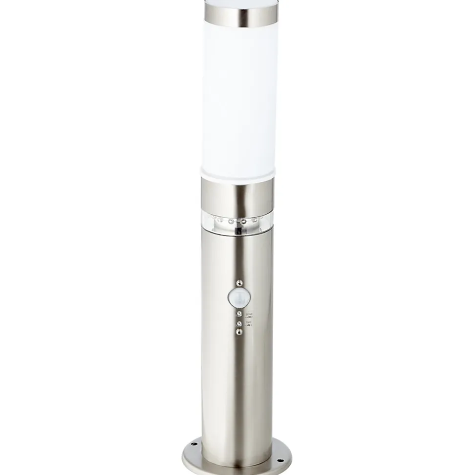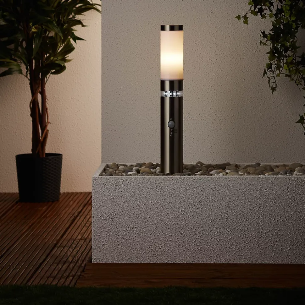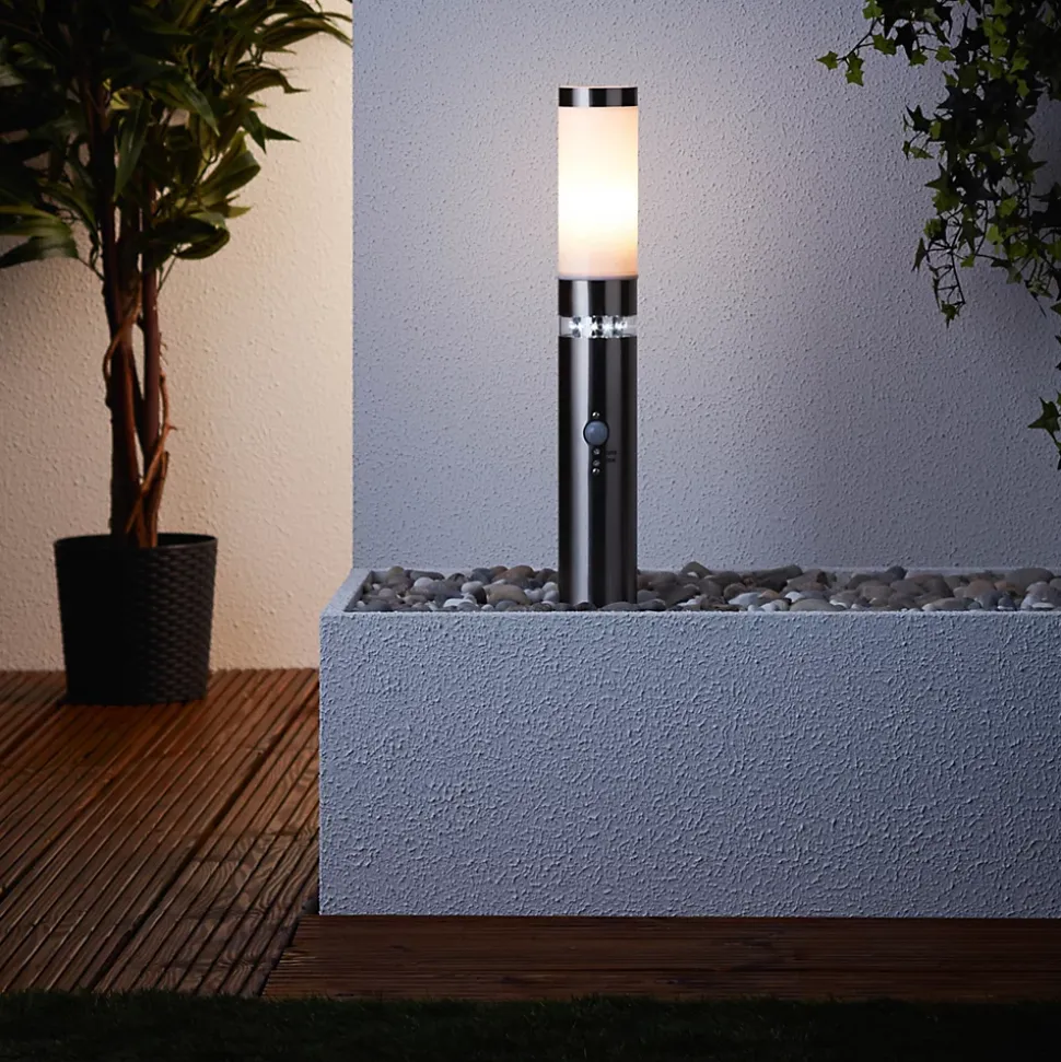 La lampe de sol BOLE s’installe sur de petits murs extérieurs ou des terrasses. Partout où un socle est déjà présent, elle peut être installée sans problème. Conçue pour des lampes normales, les sources de lumière ne sont cependant pas incluses dans la livraison. L’utilisation d’ampoules LED est toutefois possible. Le détecteur de mouvement intégré garantit sécurité et visibilité dans l’obscurité. La durée d’éclairage et la sensibilité peuvent être réglées. Grâce à l’interrupteur crépusculaire, la couronne LED décorative de la lampe s’active. Celle-ci sert de lumière d’orientation. Ce luminaire est classé IP44 et est donc parfaitement adapté à une utilisation en extérieur, même dans les zones où la protection contre les intempéries n’est pas très élevée. Tout le matériel d’installation nécessaire est inclus dans la livraison.