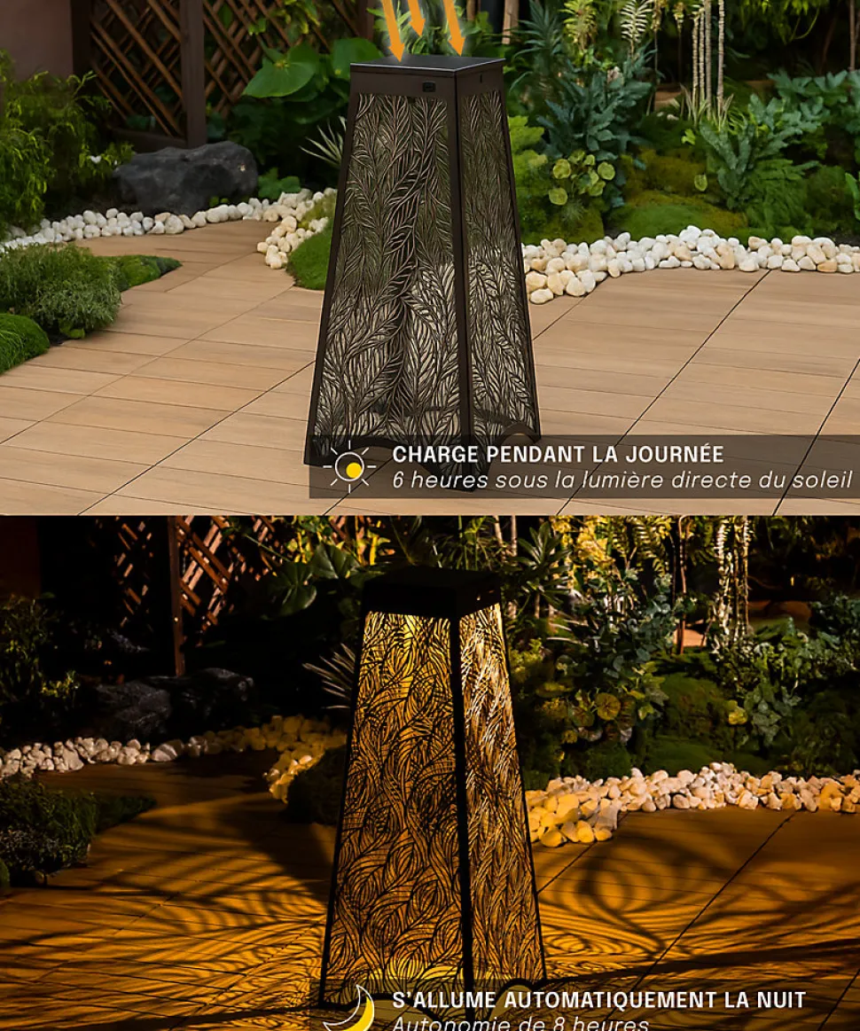 - PROJECTION DE MOTIFS AU SOL : chaque lampe projette une forme lumineuse décorative au sol, ajoutant une touche d’élégance et de raffinement à vos espaces extérieurs dès la tombée de la nuit.