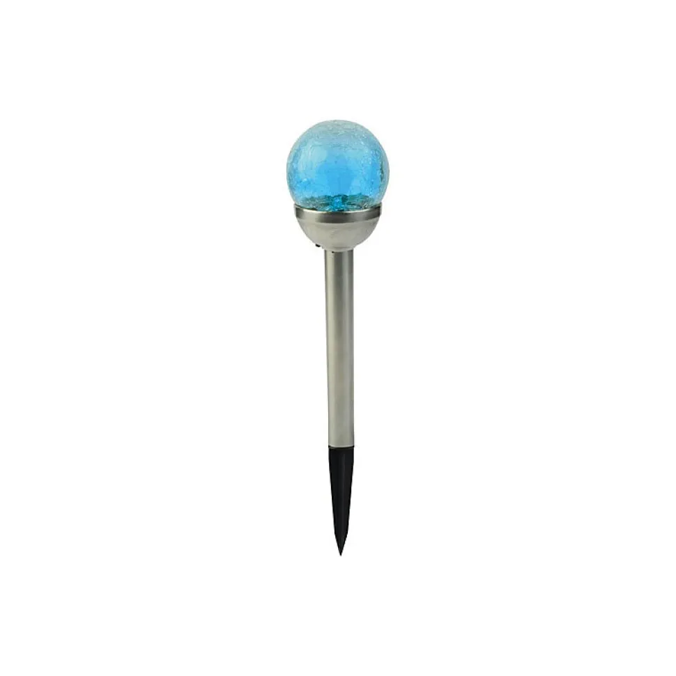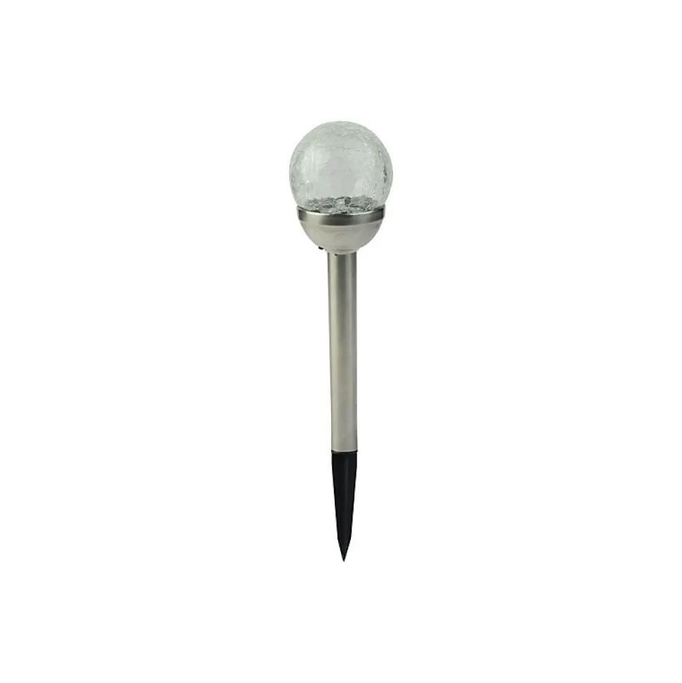 Pack de 2 bornes solaires 2 lumens, finition métal et verre craquelé, mise en route automatique grâce au détecteur de pénombre, 1 batterie (intégrée) 200mAh 1.2V par borne, autonomie jusqu’à 1h. IP44. Hauteur 38cm. Diamètre 8cm.
