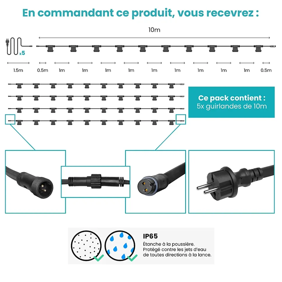 - IP65 : Grâce à la norme IP65 de notre guirlande, soyez rassuré ! Notre guirlande est étanche et ne craint pas l’eau et la poussière, vous pouvez ainsi la laisser toute l’année en extérieur !
