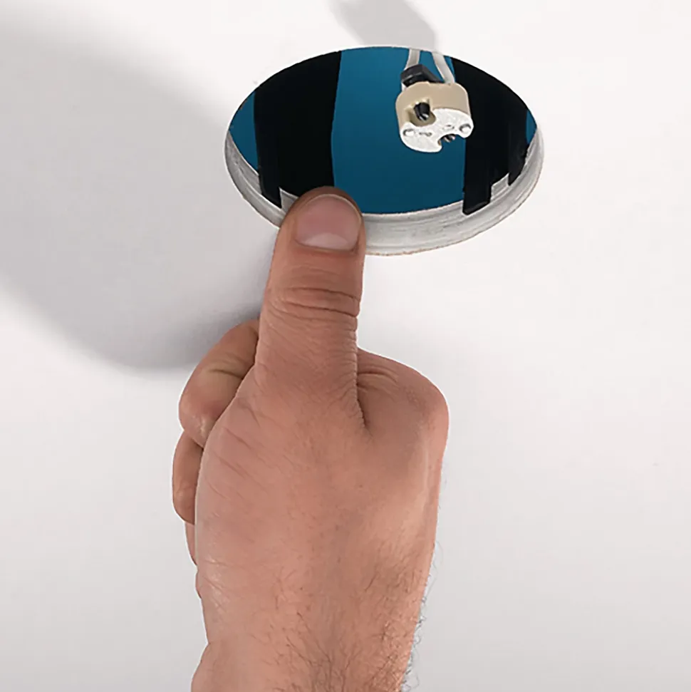 - Le SpotClip-II peut être facilement inséré par le dessous dans le faux-plafond. Il crée un écart fiable entre le spot encastrable et le matériau isolant, ce qui réduit le risque de surchauffe et d’accumulation de chaleur.