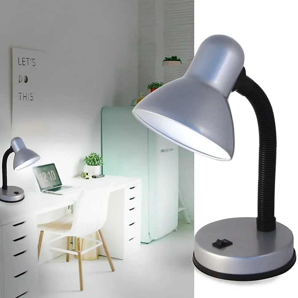 Lampe de table / bureau avec douille E27 pour ampoule (non fournie); l’ampoule peut être à LED, à incandescence ou à économie d’énergie: max 40W. Lampe munie de: bras pivotant, câble de 150 cm et interrupteur. Idéale pour les étudiants, bureau enfant, garage, établis, lampe de chevet..Abat-jour et base en métal. Un modèle classique qui ne se démode jamais.