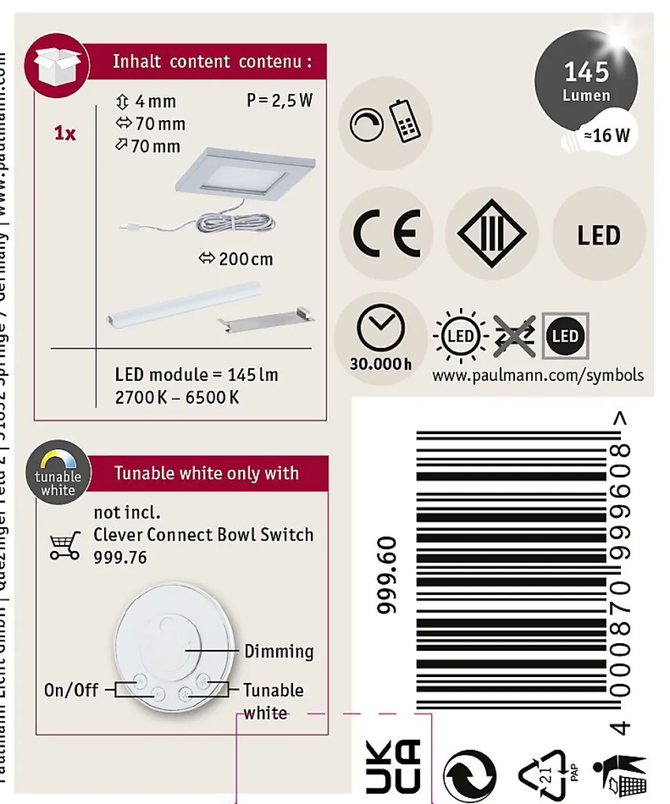 Éclairage de placard fourni avec notice de montage|Température de couleur: 2700K Blanc chaud – 6500K – Lumière du jour|Montage simple par système de connexion