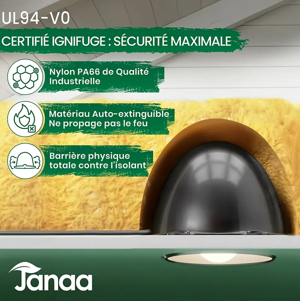 - SÉCURITÉ IGNIFUGE AVANCÉE : Conçu avec le PA66, un matériau résistant au feu, le couvercle de protection spot Janaa CX5 est idéal pour recouvrir vos spots encastrés, qu’ils soient LED, halogène, ou fluocompactes. Agissant comme un bouclier, il empêche le contact direct entre le luminaire et tout isolant (laine de verre, de roche, projeté, etc.), offrant une protection maximale contre les risques d’incendie. Profitez d’une tranquillité d’esprit absolue grâce à cette barrière de sécurité avancée.