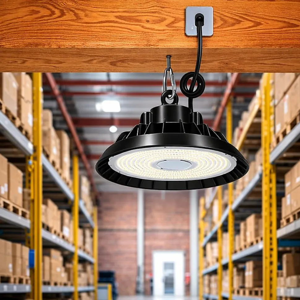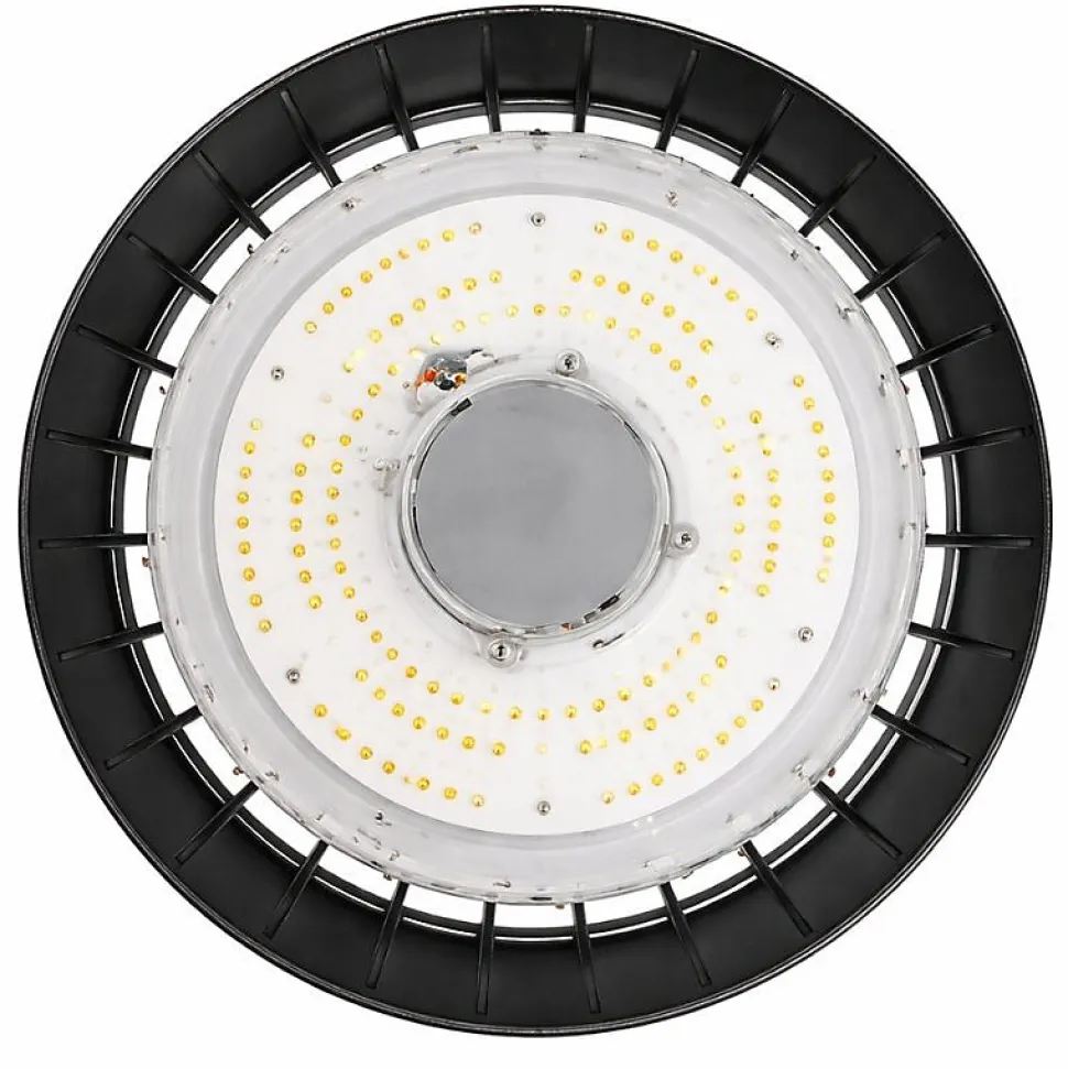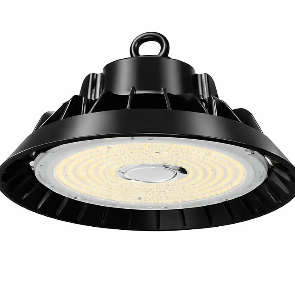 Cloche industrielle LED dont les dimensions sont idéales pour éclairer de grandes surfaces industrielles, des usines, des entrepôts et autres espaces de stockage de grand volume avec une hauteur sous plafond de 4 à 7 mètresDotée du meilleur de la technologie LED, elle permet de réaliser de grandes économies sur la facture d’électricité grâce à un flux lumineux d’environ 13 000 lumens pour une consommation de seulement 150 WattsSa couleur noire et sa forme de cloche confèrent design et modernité à votre éclairage LED industrielL’angle d’éclairage de 120 degrés permet la diffusion d’une lumière large, homogène et uniforme, sans scintillement ni émission de rayons UV La gammelle LED est conçue avec desmatériaux de qualité, est certifiée conforme aux normes CE et bénéficie d’un très bon classement A+ sur l’échelle énergétique