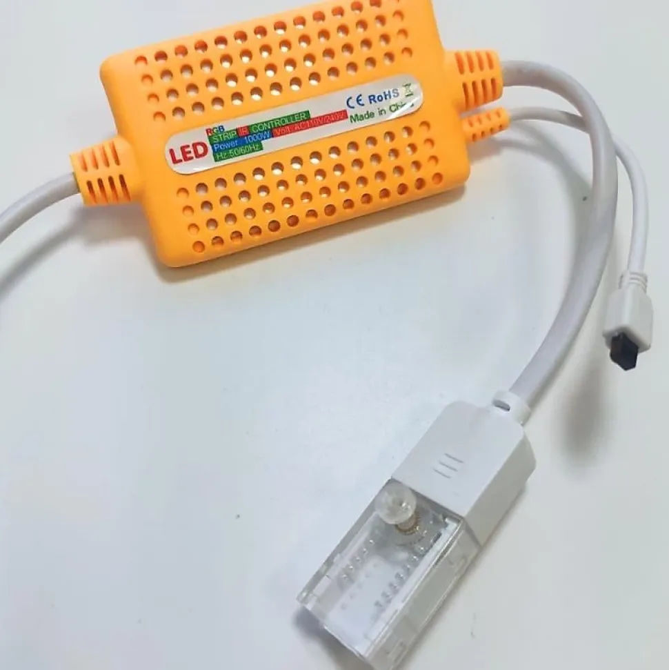 Le Contrôleur & Alimentation pour Ruban LED 220V RGB 1000W est un produit essentiel pour réguler la luminosité et les couleurs de votre bande LED 220V RGB.Caractéristiques du Contrôleur & Alimentation pour Ruban LED 220V RGB 1000WContrôle à distance via télécommandeLe contrôleur RGB 220V avec télécommande permet de contrôler à distance votre Ruban LED 220V RGB Recoupable, ainsi que de se connecter directement à une prise secteur en 220V. Si la prise est trop éloignée, il est possible de couper la prise et d’ajouter du câble. La télécommande fonctionne jusqu’à une distance de 8 à 10 mètres. Vous pouvez utiliser la télécommande pour gérer à distance les canaux RVB, sélectionner la couleur et l’effet souhaité, ajuster l’intensité et le mode d’éclairage.Certification et normes de sécuritéCet accessoire est conçu pour supporter une charge allant jusqu’à 1000W. Il est conforme aux normes CE et a une classification sur l’échelle énergétique européenne, ce qui garantit une utilisation quotidienne économe en énergie et en toute sécurité. Découvrez notre ruban LED RGB 220V disponible au mètre et en bobine de 50 mètres !ATTENTION : Ce Contrôleur & Alimentation pour Ruban LED 220V RGB 1000W est que compatible avec le Ruban LED 220V RGB Recoupable.