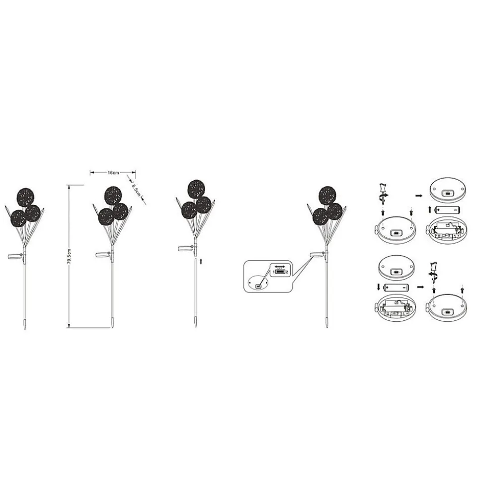 Décoration lumineuse à énergie solaire : FleursMatière : plastiqueNombre de Lumens : 2Durée maximum d’éclairage : 8 heuresInterrupteur lumière fixe / off / lumière clignotante LED : 30 LED blanc chaud (2800-3000K)Batteries rechargeables : 1 x 300mAh Ni-Mh AADimensions produits : (voir le schéma technique parmi les images)H : 795 – largeur : 160 – profondeur : 85 mm
