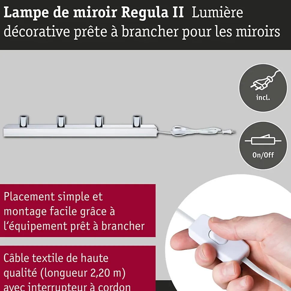 Le Regula II à 4 flammes est le choix idéal pour un éclairage de miroir décoratif. Elle est livrée avec un connecteur de câble textile pratique de couleur Chrome, rendant son installation très facile. Une seule prise de courant est nécessaire, il n’est pas nécessaire de prévoir une sortie de courant au mur. Avec son design moderne et épuré en Chrome, elle s’intègre harmonieusement dans différents styles d’intérieur et attire l’attention visuellement aussi bien sur la coiffeuse que dans le couloir. La longueur de 60 cm est adaptée aux dimensions standard des miroirs. Elle est également disponible avec différentes ampoules avec douille E14, ce qui permet de la personnaliser en fonction de l’application. Pour un look glamour de miroir de maquillage façon Hollywood, les éclairage de miroir sont particulièrement adaptées. Elles assurent un éclairage non éblouissant et créent des réflexions lumineuses très esthétiques. Pour un look moderne et classique, il suffit d’utiliser des ampoules opales qui diffusent une lumière omnidirectionnelle. L’installation du Regula II est très simple : elle peut être montée sur le mur au-dessus ou à côté du miroir. Il suffit de visser les ampoules souhaitées pour qu’elle soit immédiatement opérationnelle. Pour nettoyer les luminaires, il est préférable d’utiliser un chiffon doux – évitez d’utiliser un chiffon en microfibre. Selon l’ampoule utilisée, la lampe est dimmable.