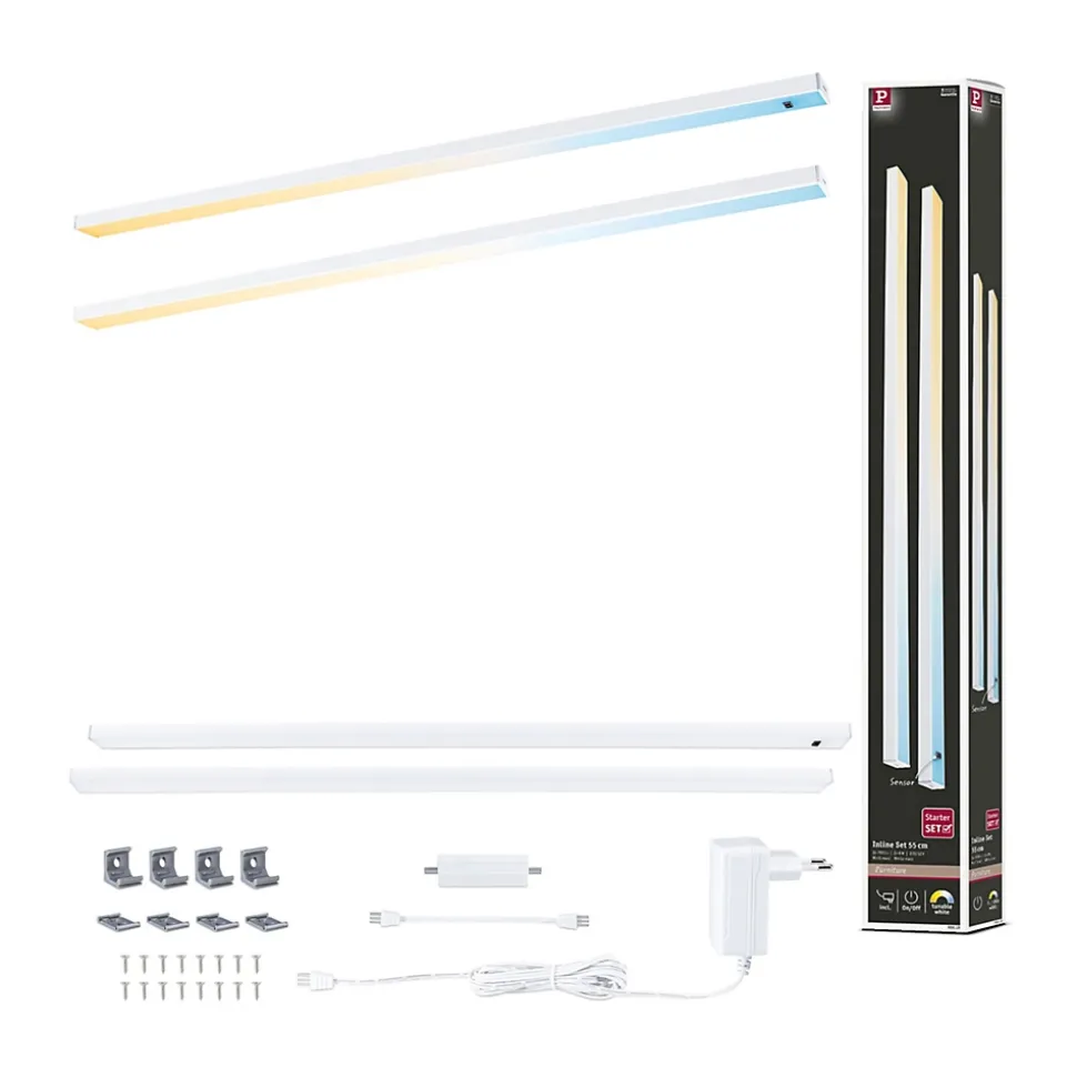 Le lot de deux éclairages sous-meubles Inline extensible en Blanc dépoli discret et de longueur 550x26mm offre une solution élégante pour l’éclairage des plans de travail. Ces luminaires pour meubles garantissent un éclairage optimal et créent une atmosphère agréable. Grâce à leur commande sans contact, ils permettent une manipulation hygiénique. Le kit de démarrage est extensible et peut être prolongé par un kit d’extension au maximum. Plusieurs longueurs peuvent être combinées entre elles pour obtenir la solution d’éclairage recherchée. La fonction Tunable White permet d’adapter l’éclairage aux besoins individuels – qu’il s’agisse de se concentrer ou de se détendre dans une atmosphère agréable. La fonction mémoire qui enregistre la température de couleur paramétrée est un plus. Le raccordement se fait directement au réseau 230 V avec un transfo-prise.
