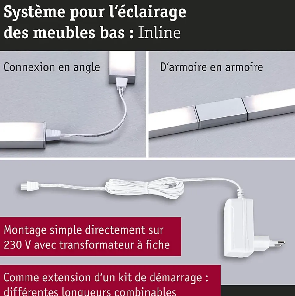 Le kit d’extension comprenant deux éclairages de meubles Inline en Chrome mat discret et de longueur 550x26mm est le complément parfait du kit de démarrage Inline. Ces luminaires sont une solution élégante pour illuminer les plans de travail de manière optimale. Les matériaux de haute qualité faciles à nettoyer font de l’entretien du dispositif un jeu d’enfants. Le détecteur de proximité permet une mise en marche et un arrêt sans contact, ce qui contribue en outre à un mode de travail hygiénique. La fonction Tunable White permet d’adapter l’éclairage aux besoins individuels – qu’il s’agisse de se concentrer ou de se détendre dans une atmosphère agréable. La fonction mémoire qui enregistre la température de couleur paramétrée est un plus.