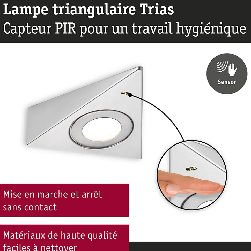 Le lot comprenant trois éclairages de meubles Trias est idéal pour la cuisine. Ces luminaires ne sont pas uniquement un accroche-regard, leur aspect pratique est redoutable. Faciles à poser, ils s’intègrent sans problème dans toutes les cuisines. Le commutateur marche/arrêt sans contact avec détecteur de proximité est un plus. La lumière blanc chaud chaleureuse garantit en outre une atmosphère agréable pour la préparation et la prise des repas. Conçus en matériaux de haute qualité faciles à nettoyer, ces luminaires sont garantis faciles d’entretien. Le montage se fait directement au réseau 230 V avec la transfo-prise fournie.