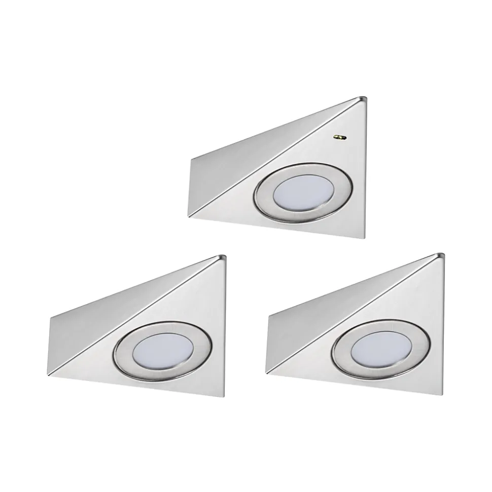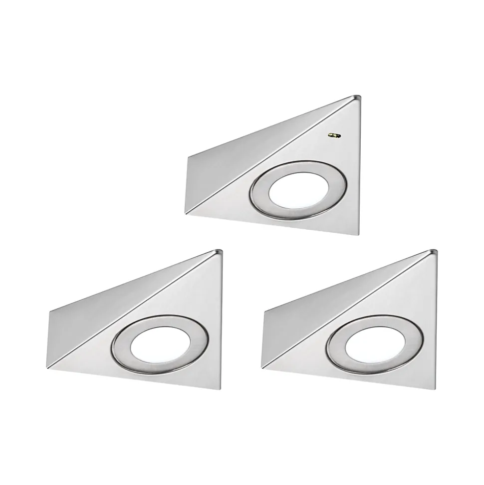 Le lot comprenant trois éclairages de meubles Trias est idéal pour la cuisine. Ces luminaires ne sont pas uniquement un accroche-regard, leur aspect pratique est redoutable. Faciles à poser, ils s’intègrent sans problème dans toutes les cuisines. Le commutateur marche/arrêt sans contact avec détecteur de proximité est un plus. Avec sa température de couleur blanc neutre, la lumière est claire et idéale pour éclairer un plan de travail de manière optimale. Conçus en matériaux de haute qualité faciles à nettoyer, ces luminaires sont garantis faciles d’entretien. Le montage se fait directement au réseau 230 V avec la transfo-prise fournie.
